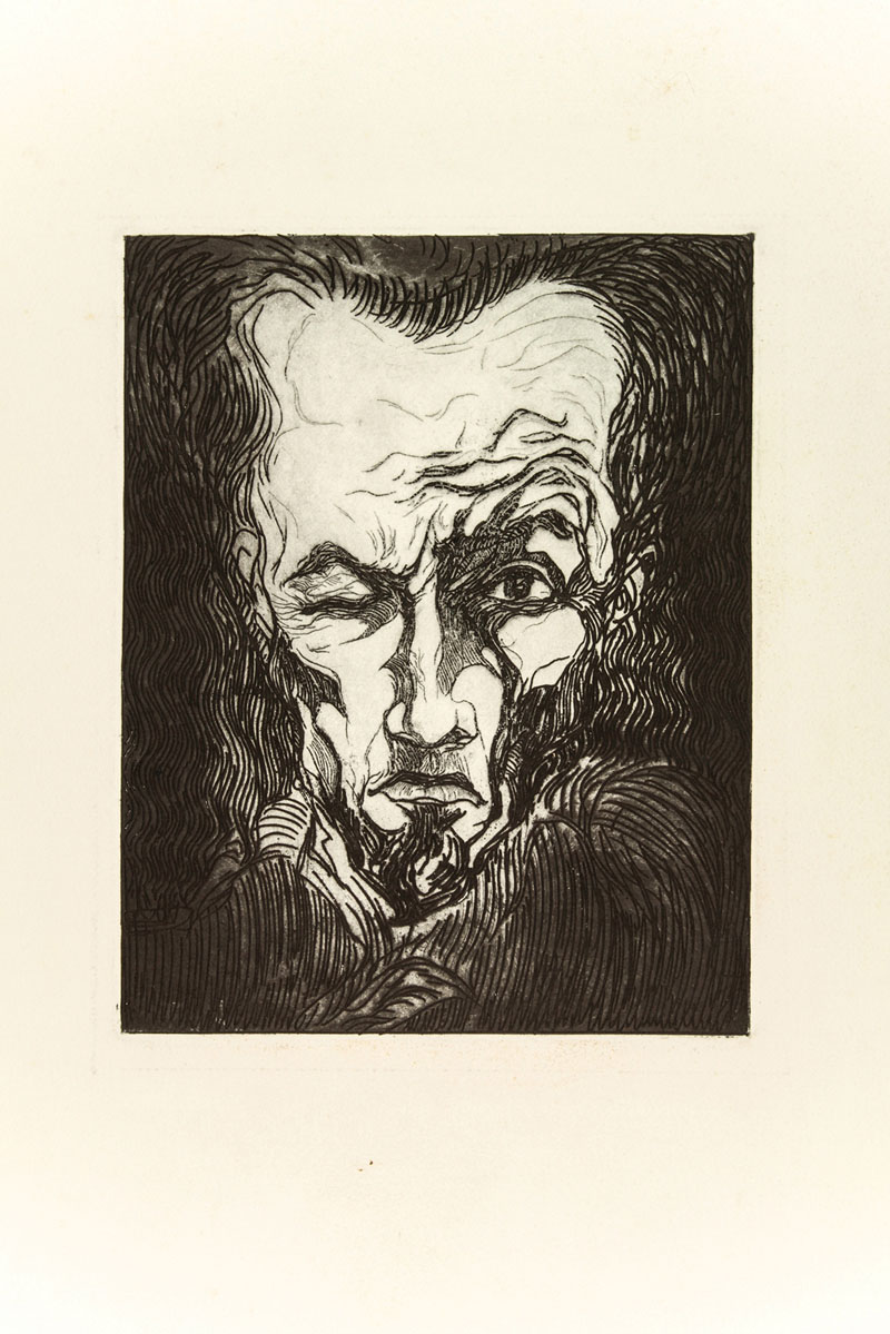 Gio Colucci (1892-1974). Volto di uomo. 1920 ca. Acquaforte. mm 295x225. Foglio: mm 650x500. In basso a matita iscrizione: "Gio Colucci". Artista prolifico ed eclettico, a partire dal 1921 espose sue incisioni ai Salons parigini (Salon d'Automne e  des Surindépendants, a fianco di artisti come Gleizes, Herbin, Robert Delaunay) affermandosi con uno stile vicino all'espressionismo e mostrando una singolare energia e predisposizione al fantastico. Fu attivo anche come pittore,  illustratore e ceramista. Tracce di polvere ai bordi, segni di pastelli colorati al verso, ma bella impressione con forte rilievo di inchiostro e con grandi margini su carta Arches.