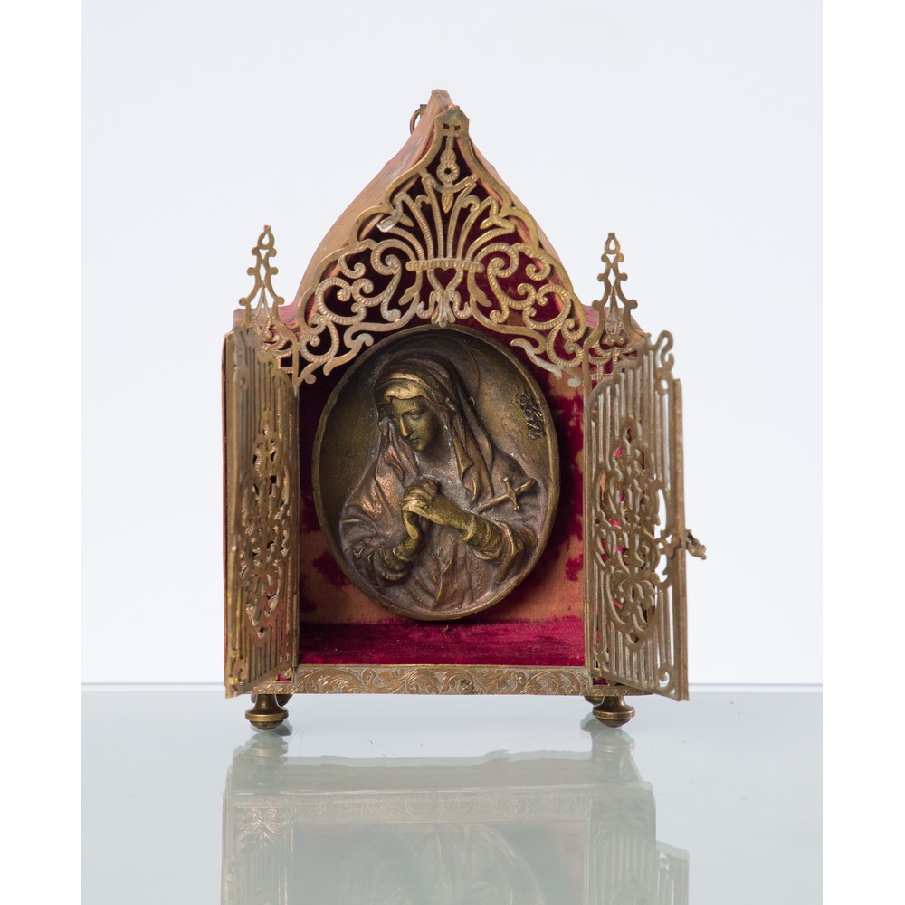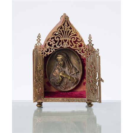 Altorilievo di forma ovale in bronzo, fusione a cera persa, entro teca neogotica in rame dorato e velluto rosso.
