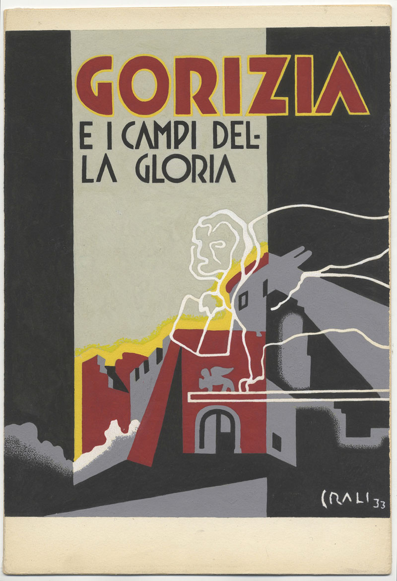 Tullio Crali (1910-2000). Gorizia e i campi della Gloria. 1933. Tempera policroma su carta avorio applicata a cartoncino. mm 325x225. Firmata e datata in basso a destra. Bozzetto originale per la copertina della terza edizione di E. Galante, Gorizia e i campi dell a gloria. G. Paternolli, 1933. Eccellente stato di conservazione.
