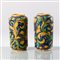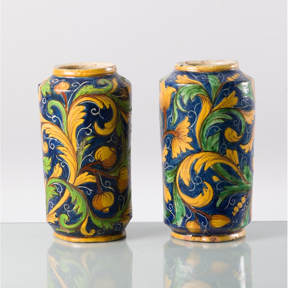 Coppia di cilindri in maiolica smaltata a motivi floreali in blu di cobalto, giallo antimonio, verde ramina con tocchi di bruno di manganese.