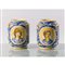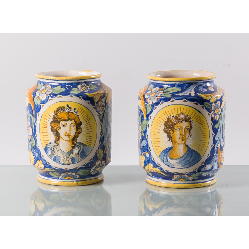 Coppia di cilindri in maiolica dipinta in blu di cobalto, giallo antimonio, verde ramina e bruno di manganese.