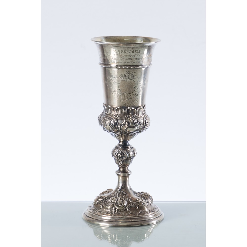 Calice in argento riccamente sbalzato e cesellato. Reca incisione "Ehrenpreis, gestiftet von Gustav Prinz, mitglied der radfahr union yorwaerts" (usure).