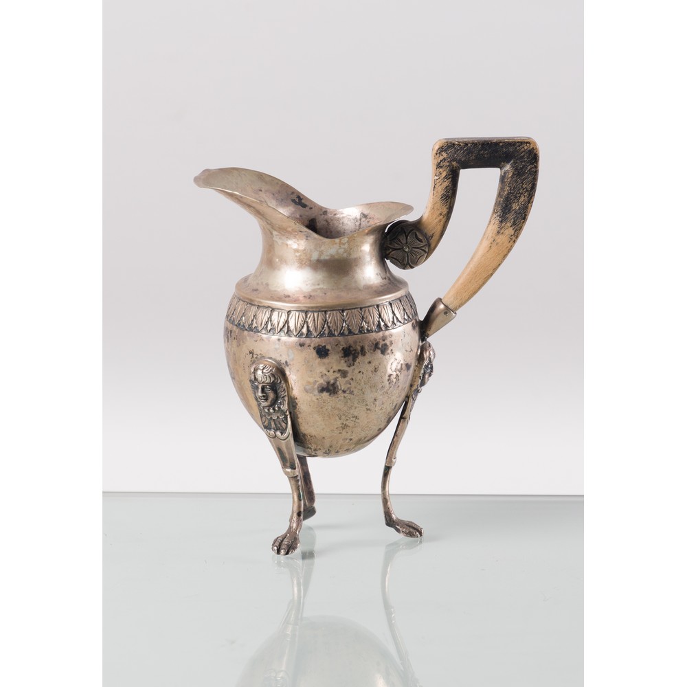 Lattiera Return d'Egypt in argento inciso e sbalzato, piedi a zampa leonina e manico in legno ebanizzato.
