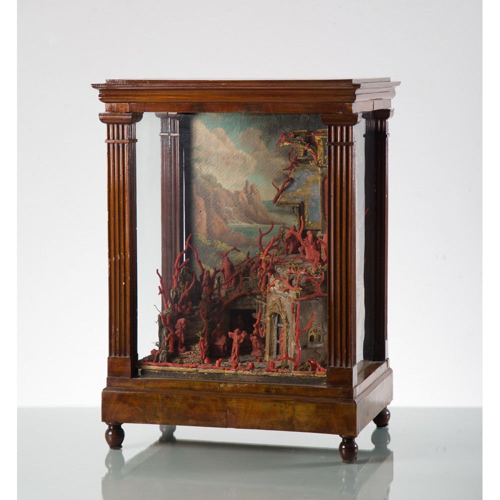 Presepio realizzato con rami di corallo rosso del Mediterraneo e sculture di pastori in terracotta dipinta a finto corallo, entro teca di stile impero in legno di noce.