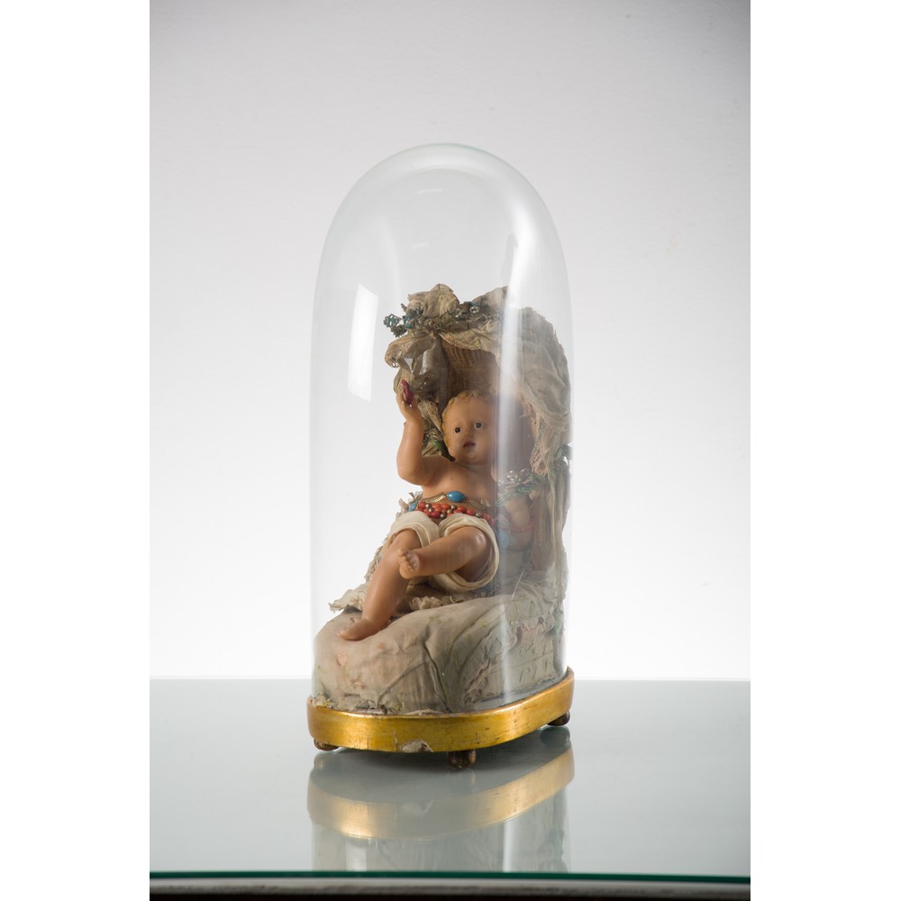 Scultura in ceroplastica adornata da coralli e pietre dure, entro campana in vetro con base in legno dorato (rottura alla campana).