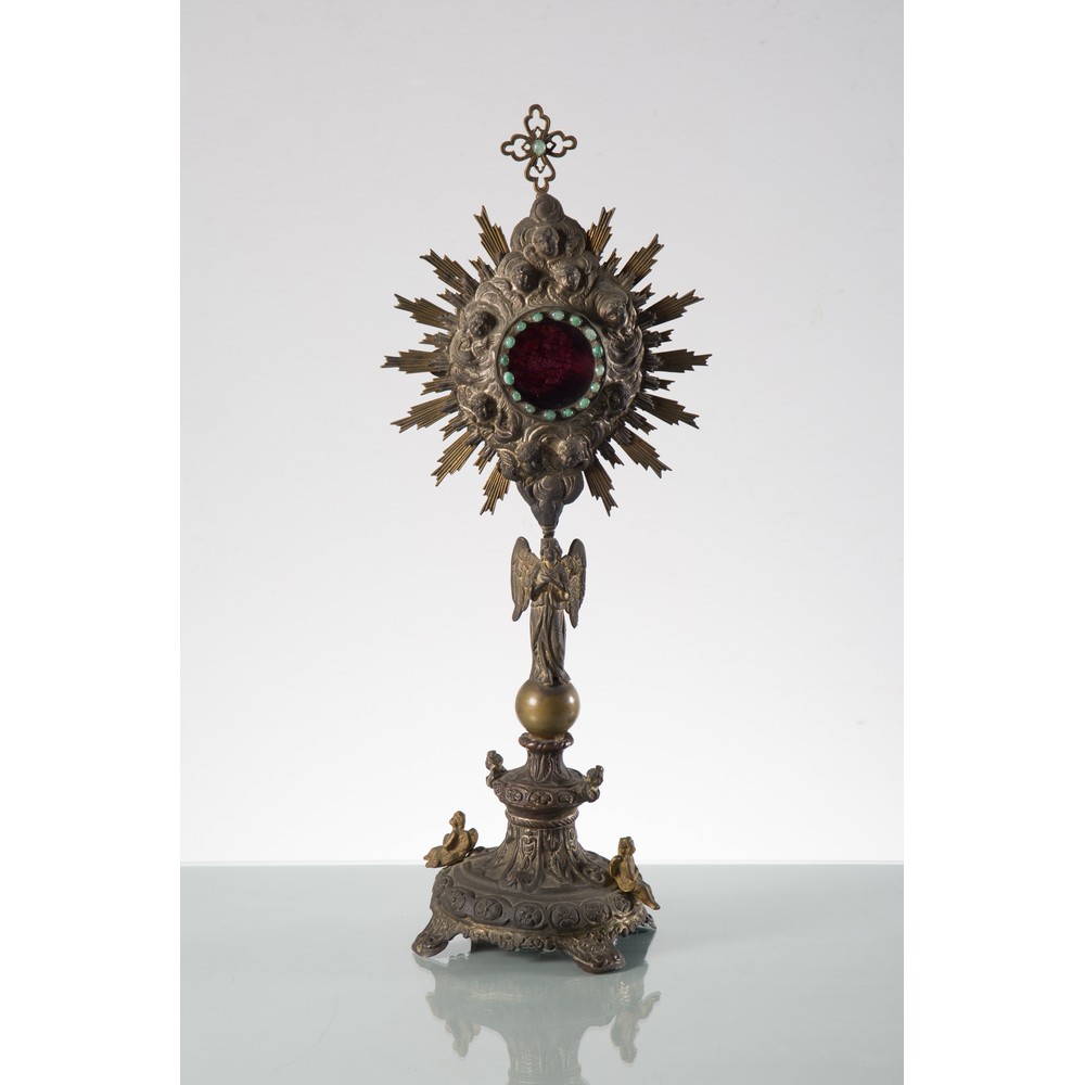 Ostensorio in metallo cesellato, base lavorata con putti, teste di cherubini ed angelo su globo che sorregge raggiera decorata con teste di cherubini ed innesti di pietre dure.