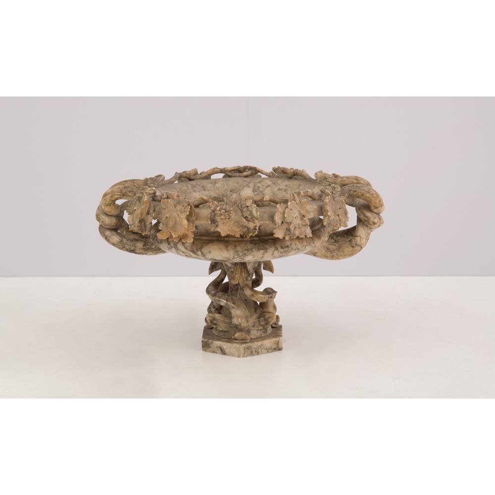 Alzata in alabastro scolpito con grappoli d'uva, manici a foggia di serpenti intrecciati, poggiante su base con tritoni (lievi mancanze ed usure).