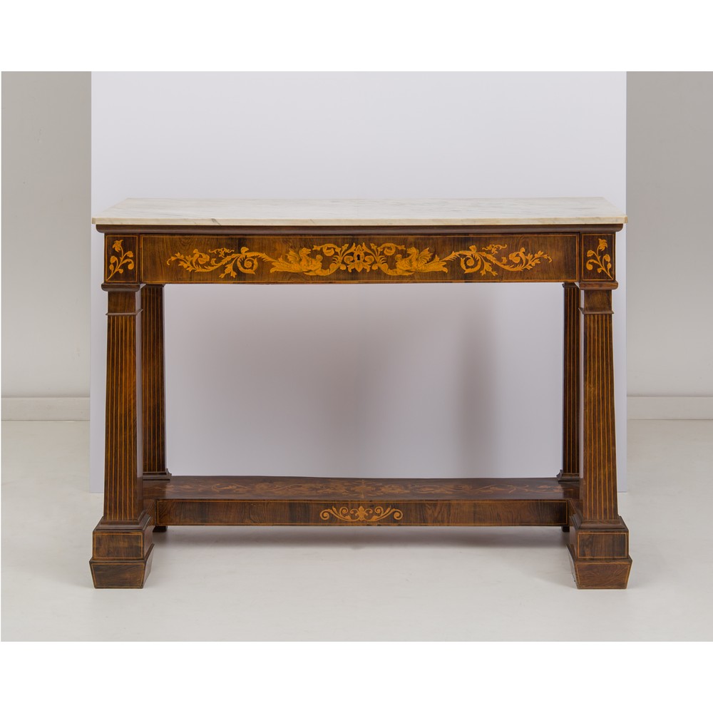 Consolle Carlo X con cassetto in legno lastronato con perfili e tarsie in bosso, piano in marmo bianco di Carrara