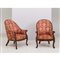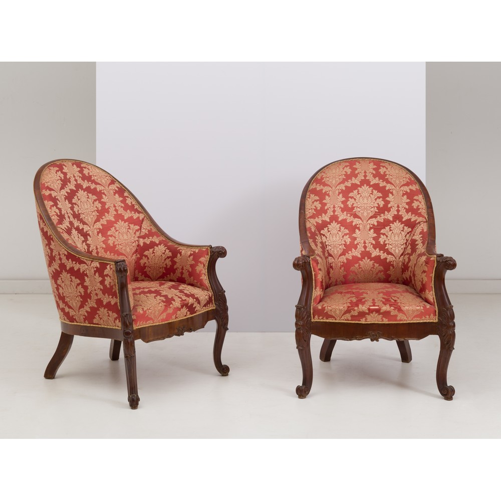 Coppia di poltrone Luigi Filippo in legno lastronato in piuma di mogano, tappezzeria in broccato di seta rossa