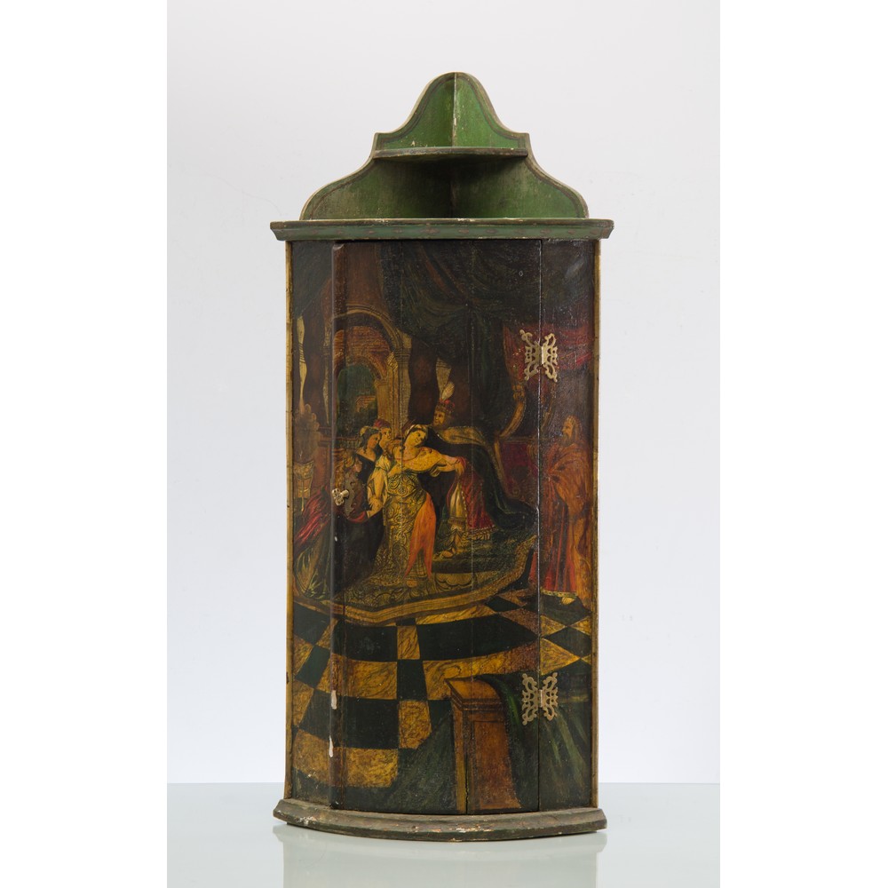Angoliera Luigi XIV in legno di abete, con piani e base a lacca verde, corpo centrale interamente dipinto con la scena 'La famiglia di Dario davanti ad Alessandro Magno'; cerniere in bronzo dorato.