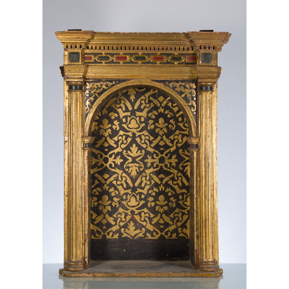 Edicola a tempietto tardo-rinascimentale in legno di abete laccato e dorato