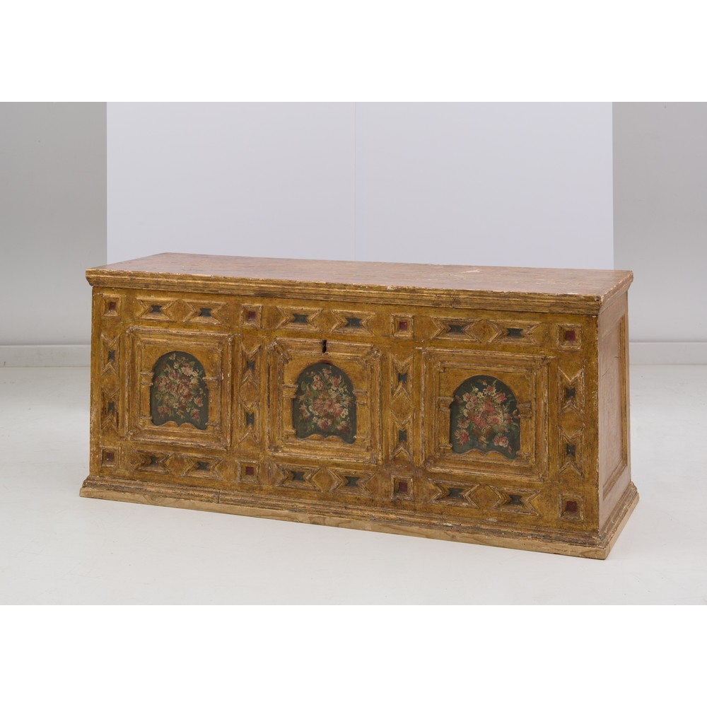 Pregevole cassapanca in legno dorato, con pannello frontale intagliato a motivi geometrici e laccato con composizioni floreali