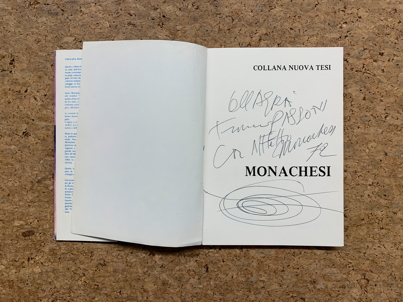 Presenta le prime due pagine staccate dal resto della brossura; su una di queste è presente la firma, la dedica al critico Franco Passoni e un disegno a biro dell'Artista