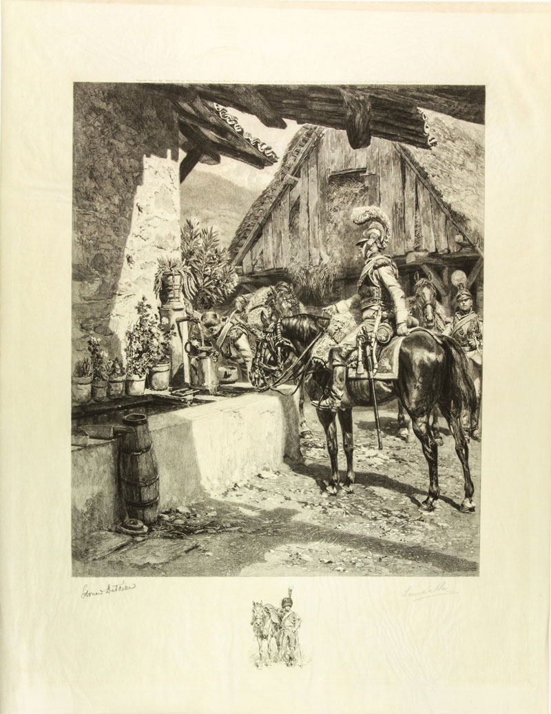 Jean-Baptiste ÉdouardDetaille(? -?). L'abreuvoir. 1900. Bulino su acciaio mm. 590x460. Foglio: mm. 625x485. Nella lastra in basso a sinistra: "Edouard Detaille 1900". Remarque in basso al centro. In basso ai lati firme a matita di Detaille e di Léon Salles, l'incisore traduttore del dipinto. Detaille si arruolò nell'8° battaglione mobile dell'esercito francese quando scoppiò la guerra franco-prussiana. Divenne pittore ufficiale e raffigurò le manovre militari, le uniformi e la vita di campo in generale consacrandosi al genere di battaglie. Nel 1885 pubblicò L'Armée Française contenente la riproduzione di oltre 300 suoi disegni. Bellissima impressione su carta japon. Ottima conservazione.