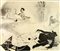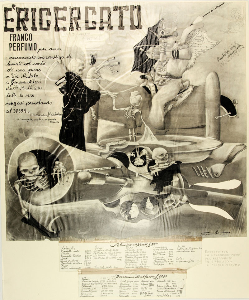 Gianni Di Mauro (Attivo nella seconda metà del sec. XX a Genova ). Due bozzetti per manifesti. 1975 ca. 1) Bozzetto per il manifesto della libreria femminista "La metà del cielo". China e inchiostro acquerellato su carta oleata mm. 490x595. Firmato a penna in basso a destra. Incollato su cartoncino recante il titolo a matita. 2) Bozzetto per la locandina-menu del ristorante "Il diabolico" di Franco Perfumo (a Genova Nervi). China e inchiostro acquerellato su carta oleata mm. 470x485. Firmato in basso a desta a matita e a penna. Incollato su cartoncino. Nella parte inferiore aggiunte due strisce di carta con il menu. -