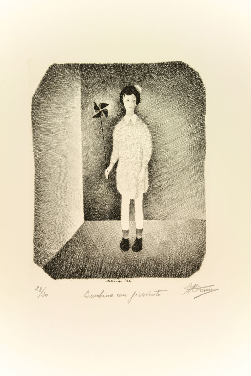 Armando Donna (1913-1994). Bambina con giravento. 1954. Bulino mm. 285x230. Foglio: mm.495x350. Firmato e datato nell'inciso in basso al centro. In basso a matita tiratura, titolo, firma e data. Es. n. 29/30. Timbro a secco in basso a destra. Impresso su carta con filigrana Fabriano. -