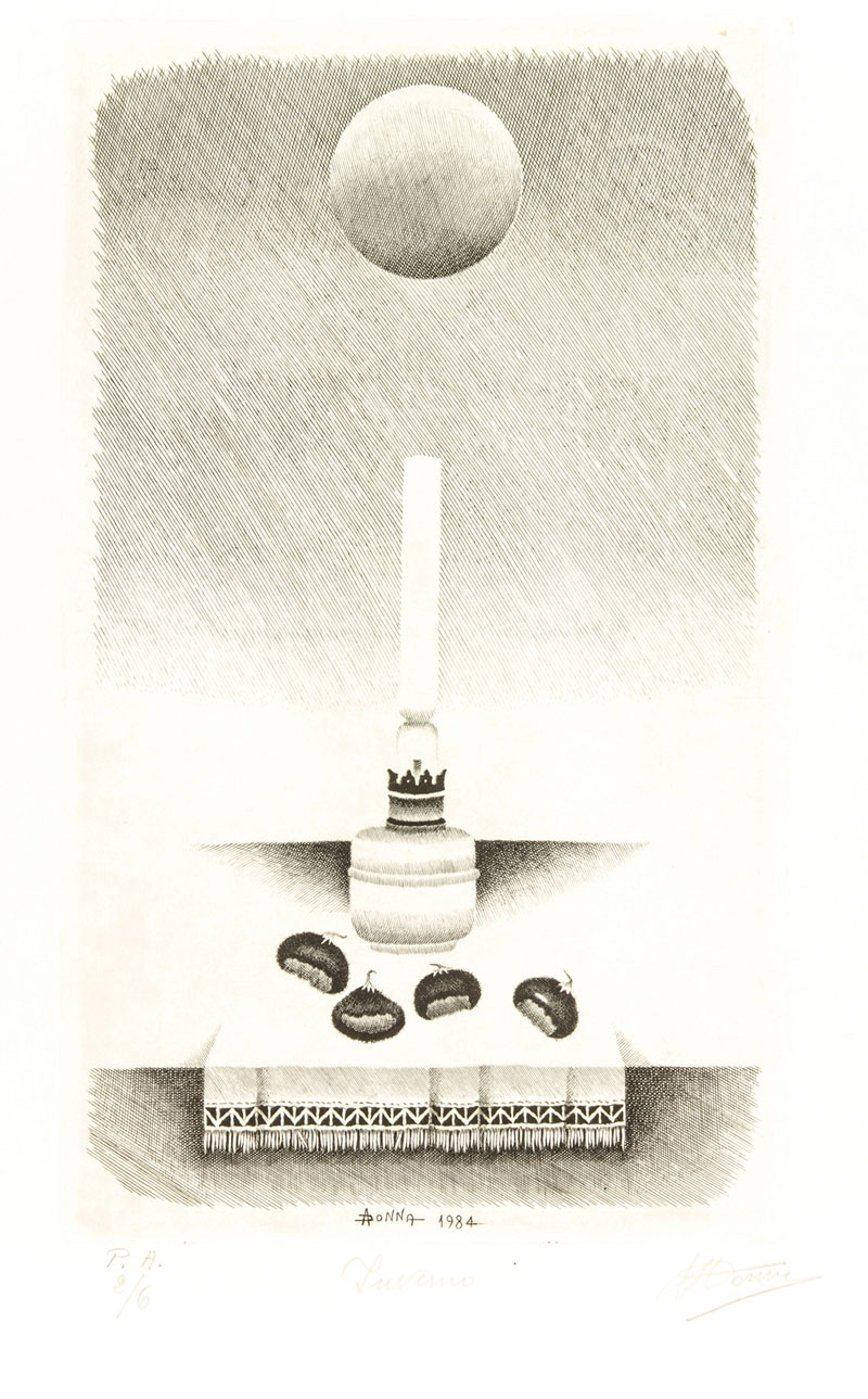 Armando Donna (1913-1994). Inverno. 1984. Bulino mm. 330x195. Foglio: mm. 695x500. Firmato e datato nell'inciso in basso al centro. In basso a matita tiratura, titolo e firma. Es. P. A. n. 2/6. Timbro a secco in basso a destra. Impresso su carta con filigrana Fabriano. -