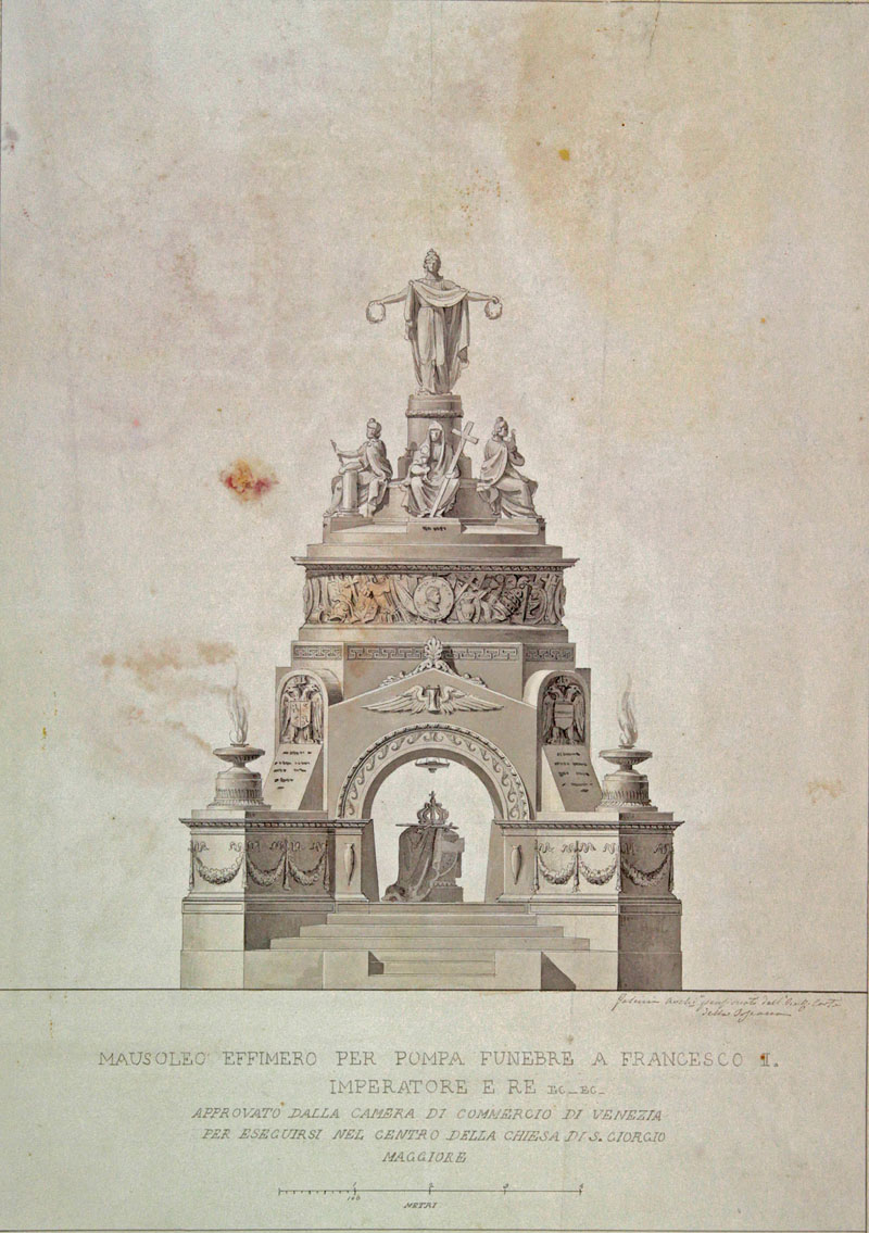 Mariano Falcini (1804-1885). Mausoleo effimero per pompa funebre a Francesco I Imperatore e Re. 1835. Inchiostro bistro acquerellato mm. 365x274. Firmato in basso a destra. Sotto: "Mausoleo effimero per pompa funebre a Francesco I Imperatore e Re / Approvato dalla Camera di Commercio di Venezia per eseguirsi nel centro della chiesa di S. Giorgio Maggiore". Architetto, si diplomò all'Accademia di Belle Arti di Firenze con Giuseppe Cacialli. Dopo un periodo di perfezionamento, divenne aiuto di Pasquale Poccianti, facendo carriera nello Scrittoio delle Regie Fabbriche. Nel 1850 fu nominato professore dell'Accademia fiorentina di Belle Arti, in cui si era formato. Quindi divenne collaboratore del grande architetto fiorentino Giuseppe Poggi, l'autore del piano di sistemazione urbanistica per Firenze negli anni sessanta del XIX secolo. Lievi tracce d'umidità, altrimenti ben conservato.