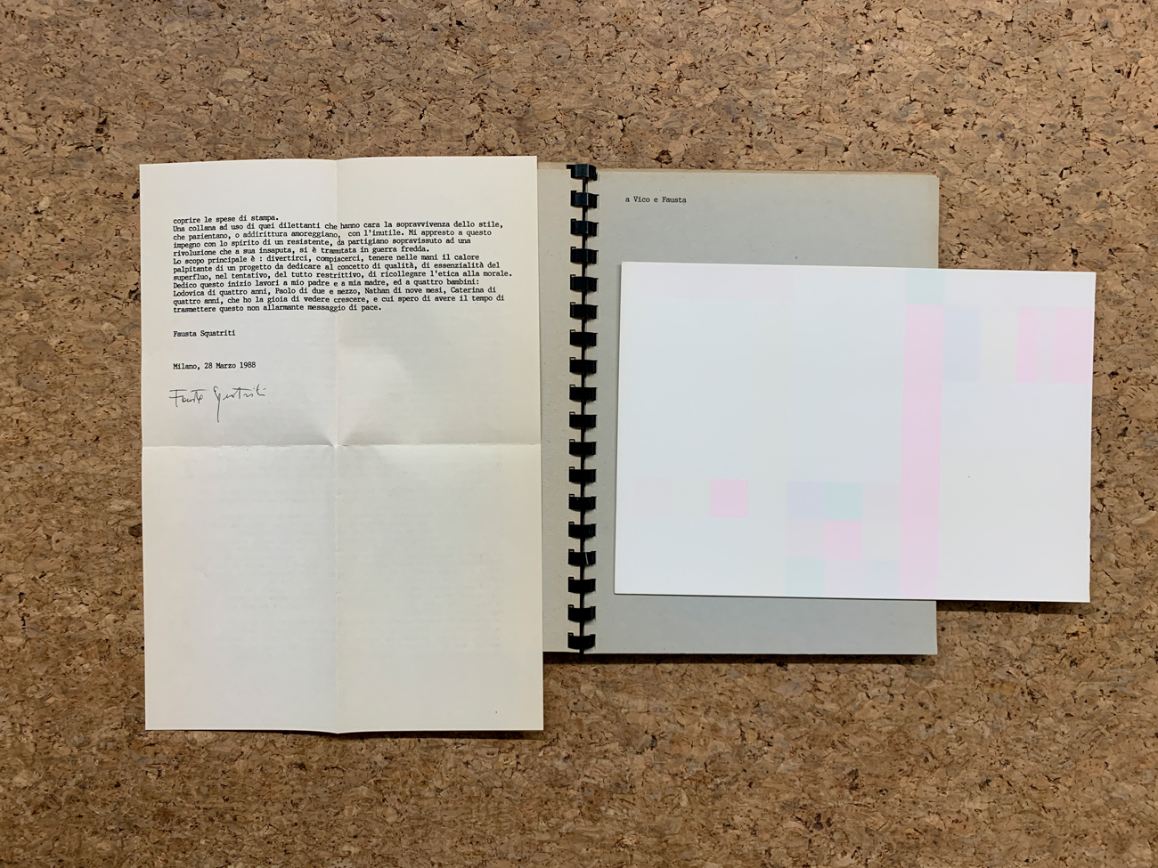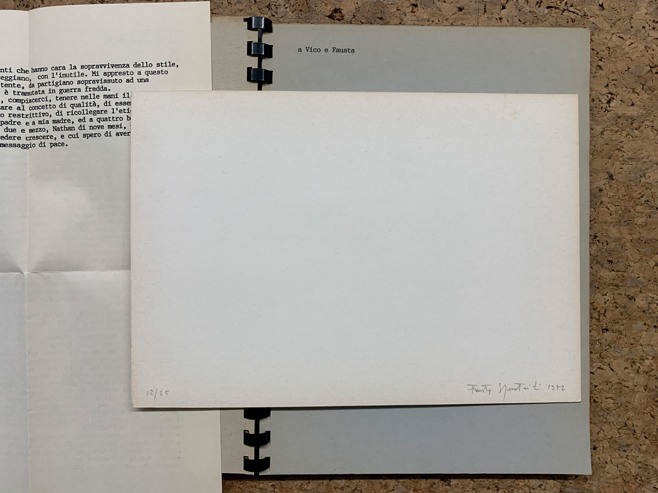 All'interno è presente un foglio recante un testo dattiloscritto di presentazione dell'opera redatto da fausta Squatriti, firmato di pugno dall'Artista