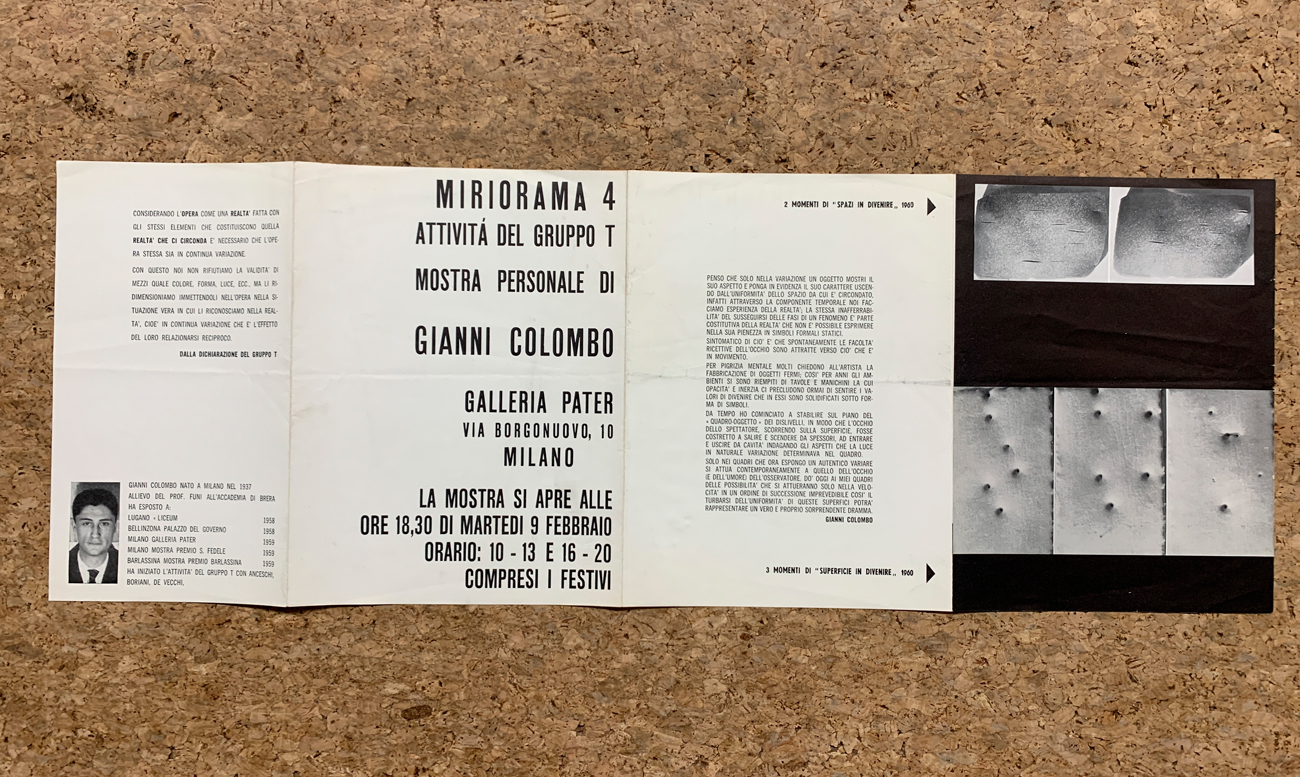 Il pieghevole presenta un testo e alcune immagini di opere di Gianni Colombo e un estratto dalla dichiarazione programmatica del Gruppo T