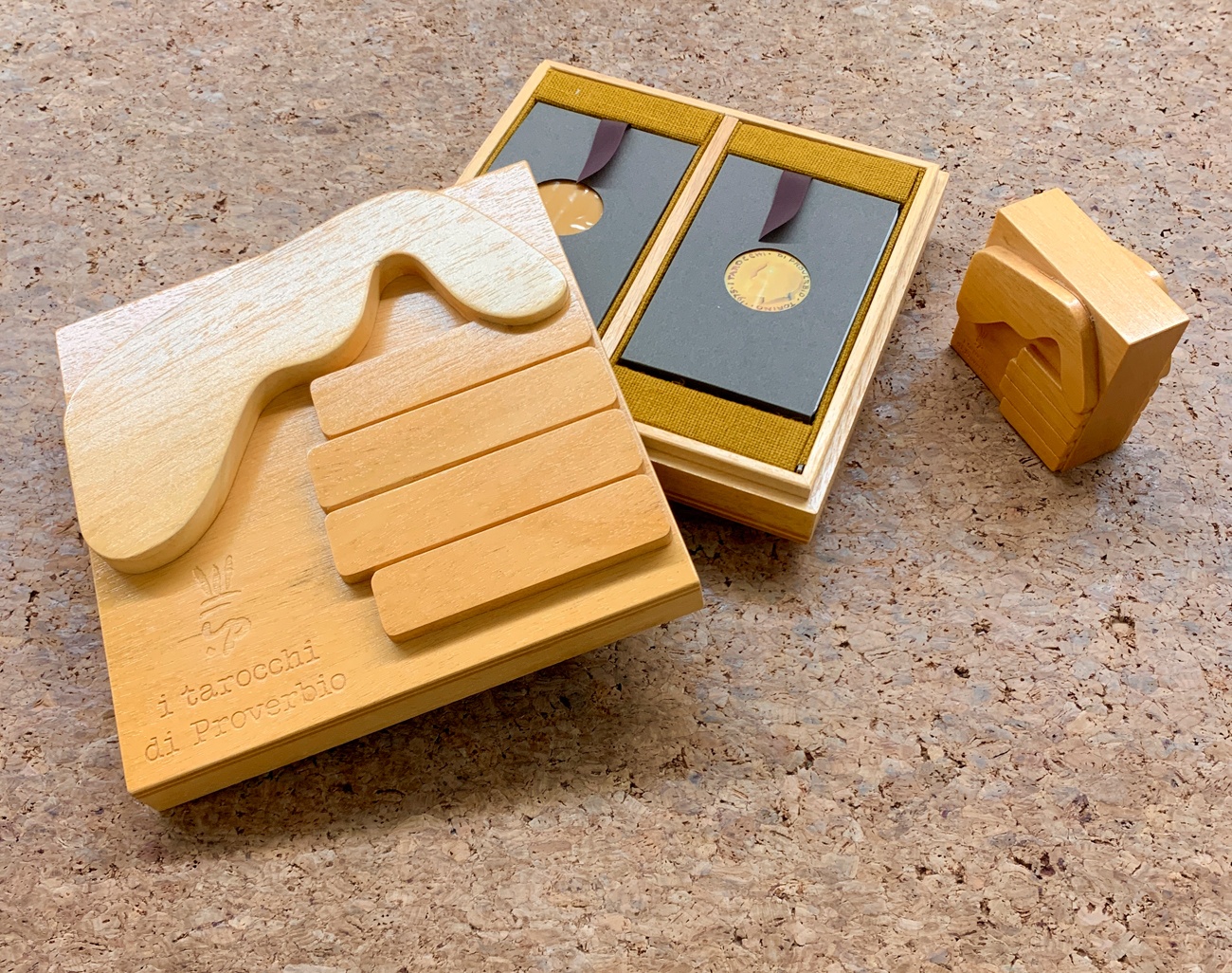 - gioco completo dei tarocchi con due mazzi di carte sigillati (complessive 78 carte) e portacarte in legno sagomato