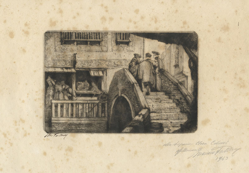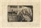 Mariano Fortuny y Madrazo (1871-1949). El mercader de Venecia. Acquaforte e rotella. mm 135x202. Foglio: mm 235x337. Vives i Pique-Cuenta Garcia, 18. Firmata a penna in basso a sinistra. In basso a destra dedica a matita dell'artista in data 1943. Terzo stato definitivo. Bella impressione stampata su carta avorio, parzialmente incollata su originario cartoncino di supporto. Ampi margini, fioriture diffuse, altrimenti ottima conservazione.