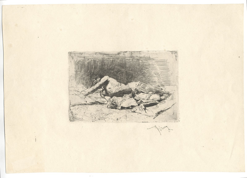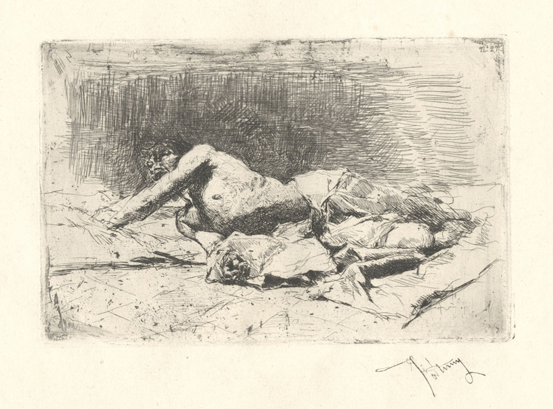Mariano Fortuny y Marsal (1838-1874). Uomo disteso al suolo (Il moribondo). Acquaforte. mm 110x170. Foglio: mm 260x365. Vives i Pique/Cuenca Garcia, 27. Timbro riproducente la firma dell'artista in basso a destra. Sulla lastra in alto a destra: «N. 27». Esemplare appartenente alla terza tiratura (1878). Bella impressione stampata su carta Arches. Ampi margini, lievissime tracce di fioriture, ottima conservazione.