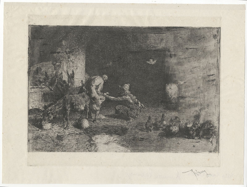 Mariano Fortuny y Marsal (1838-1874). Herrero marroquì (Maréschal ferrant au Maroc). Acquaforte e acquatinta. mm 206x262. Foglio: mm 245x325. Vives i Pique-Cuenta Garcia, 22. Timbro con la firma dell'artista in basso a destra. Al verso dedica a penna della nuora Henriette Fortuny. Esemplare appartenente alla seconda tiratura (1878) avant la lettre. Freschissima impressione prima dell'acciaiatura stampata su carta China a pieni margini. Residuo di imbrachettatura al verso, ma perfetta conservazione.