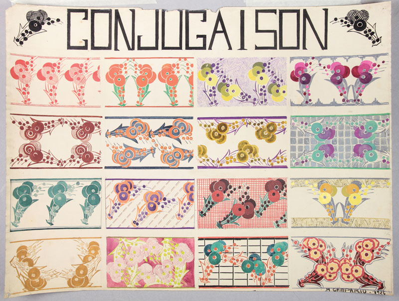 M. Gampario (Prima metà sec. XX ). Conjugaison. 1926. Tempera policroma e tracce di matita di grafite su cartoncino avorio. mm 475x630. Firmato e datato in basso a destra «M. Gampario - 1926». Titolo in alto al centro. Tavola contenente 16 studi di motivi geometrico-floreali di gusto Decò per decorazioni. Piccoli fori agli angoli e una lacuna al margine superiore che coinvolge, in minima parte, il titolo.