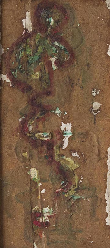 Franco Angeli Olio su carta apposta su compensato 40x18 Senza titolo 1959 Archivio Franco Angeli; Firma sul retro: "Angeli", con dedica autografa: "Dedicato a Roberta 2.3.59"
