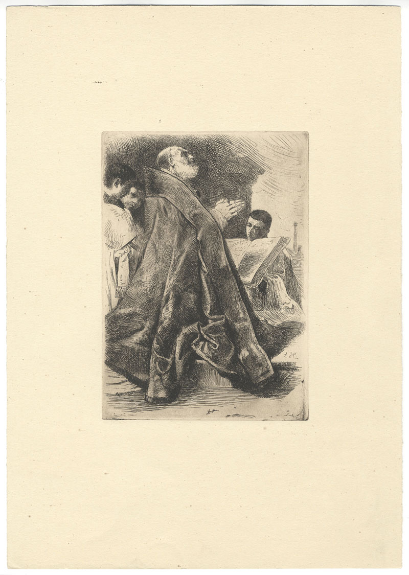 Alfonso Holländer (1845-1923). Prelato in preghiera. Acquaforte. mm 181x130. Foglio: mm 353x249. Monogrammata sulla lastra in basso a destra. Bella impressione stampata su carta avorio pesante. Grandi margini, ottima conservazione.