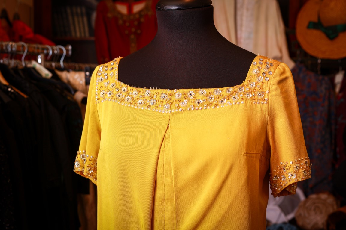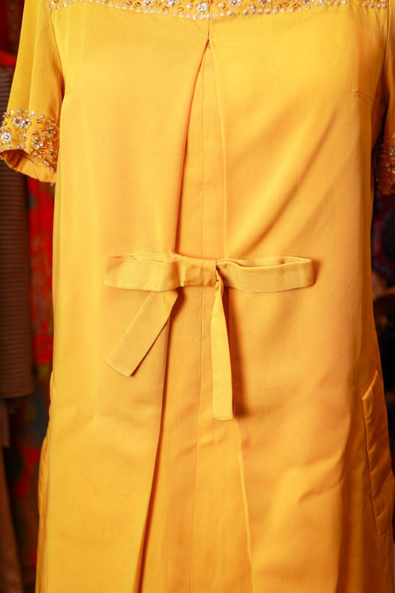 In cotone giallo, scollo quadrato ornato, come i bordi delle mezze maniche, da paillettes opalescenti, fiocco ornamentale al centro