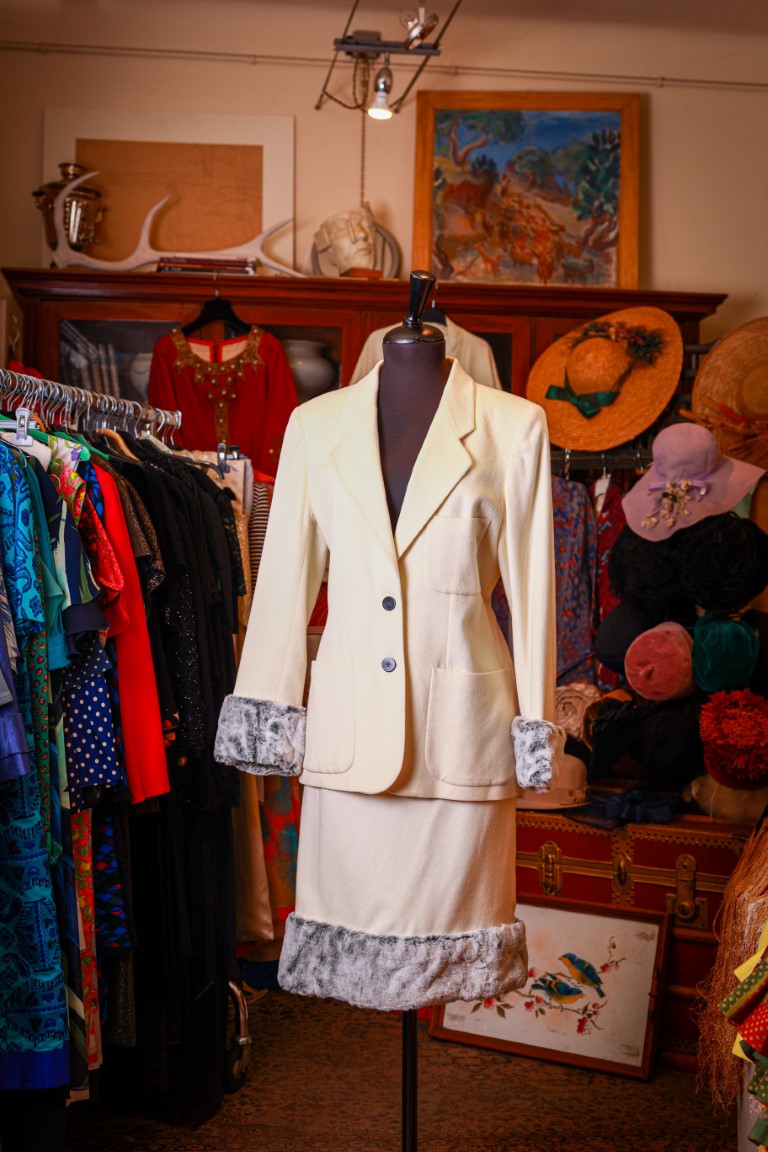 Composto da giacca e gonna, polsino e bordo della gonna ornati da pelliccia ecologica grigia
