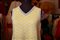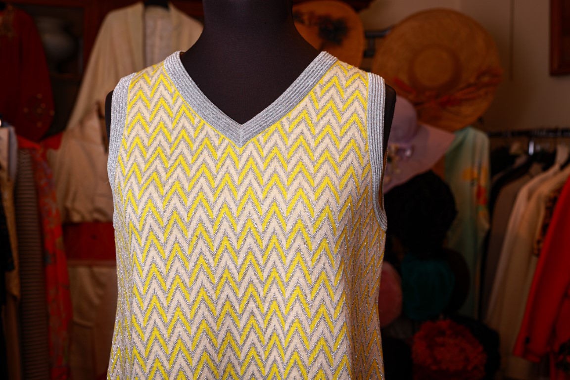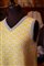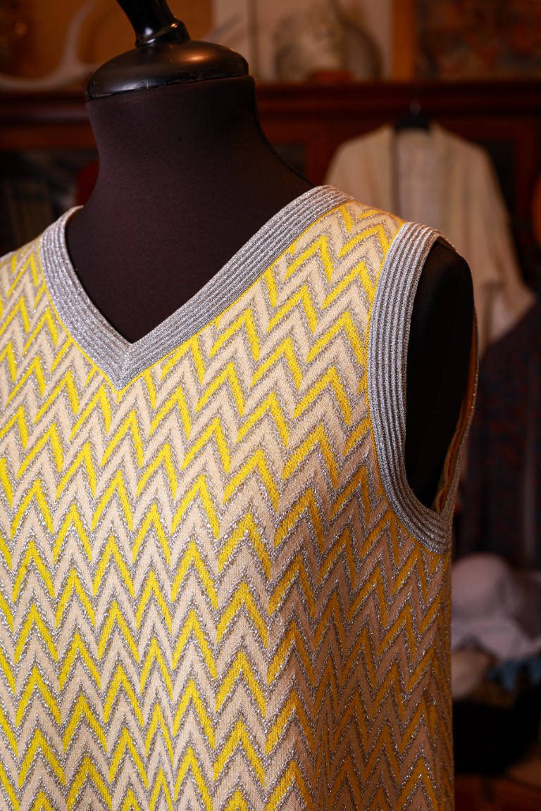 in maglina gialla e bianca e arancione con disegni geometrici in lurex