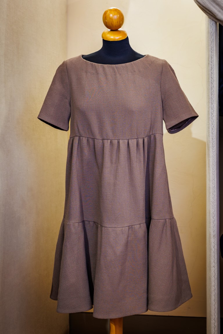 Rina Milano, Abito in lana marrone con gonna a balze