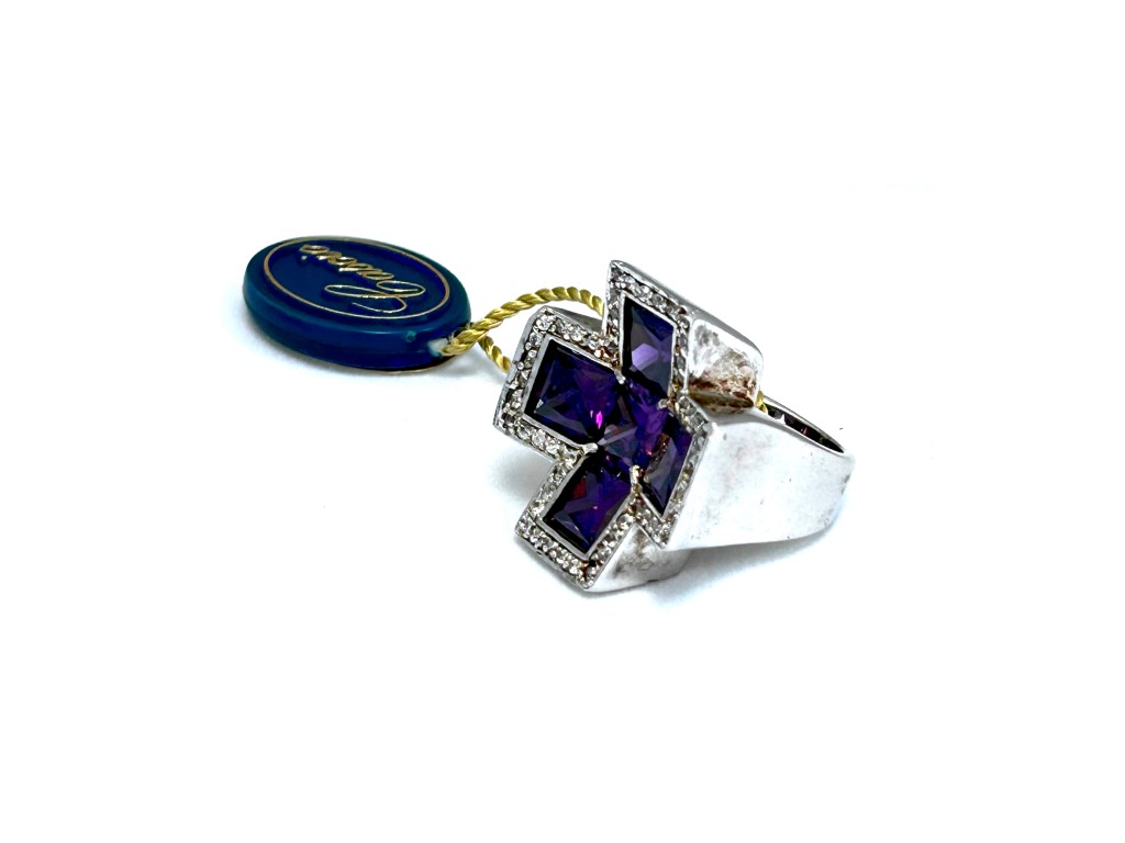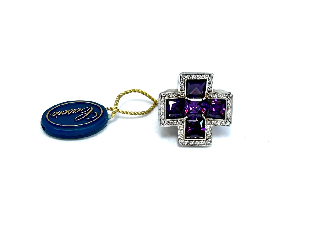 Cascio (cartellino) a forma di croce con cristalli viola simulanti l'ametista e strass incolore