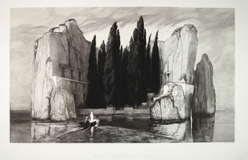 Max Klinger (1857-1920). Die Todteninsel (L'Isola dei Morti). 1890. Acquaforte e acquatinta. mm 417X696. Foglio: mm 520X790. Singer, 327. In basso ai lati, sotto alla parte incisa: «A. Böcklin pinx. - Max Klinger sculp. / Die Toteninsel». IX stato su 9. L'incisione raffigura una delle cinque versioni dell'Isola dei morti, esattamente quella dipinta da Böcklin nel 1883 e venduta per la prima volta dal mercante berlinese Fritz Gurlitt nel 1884 a Tina Schoen-Renz in Worms. Gurlitt commissionò a Klinger il compito di tradurlo in incisione allo scopo di promozione pubblicitaria e l'artista accettò il lavoro con entusiasmo per la sua profonda ammirazione nei confronti del pittore di Basilea. Bellissima impressione stampata su carta China applicata. Buoni margini ma rifilati (i margini superiore e inferiore rifilati entro l'impronta della lastra con perdita dell'indirizzo dello stampatore, ma ben oltre la parte incisa), per il resto ottima conservazione.
