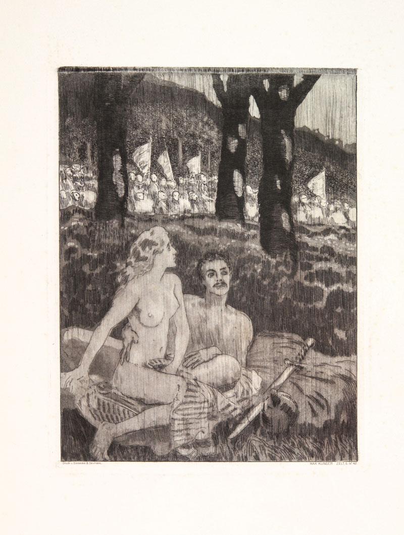 Max Klinger (1857-1920). Waldnacht. 1915 ca. Acquaforte. mm 228x180. Foglio: mm 585x400. Stampato nel margine inferiore: «Druck v. Giesecke & Devrient - Max Klinger Zelt, II N. 42». Quarantaduesima tavola da Zelt II. Opus XIV, serie di 46 incisioni pubblicate per la prima volta a Lipsia nel 1915. Bellissima impressione stampata su carta China applicata. Grandi margini, lievi tracce di sporco e minime fioriture marginali, residui di adesivo al verso, per il resto ottima conservazione.