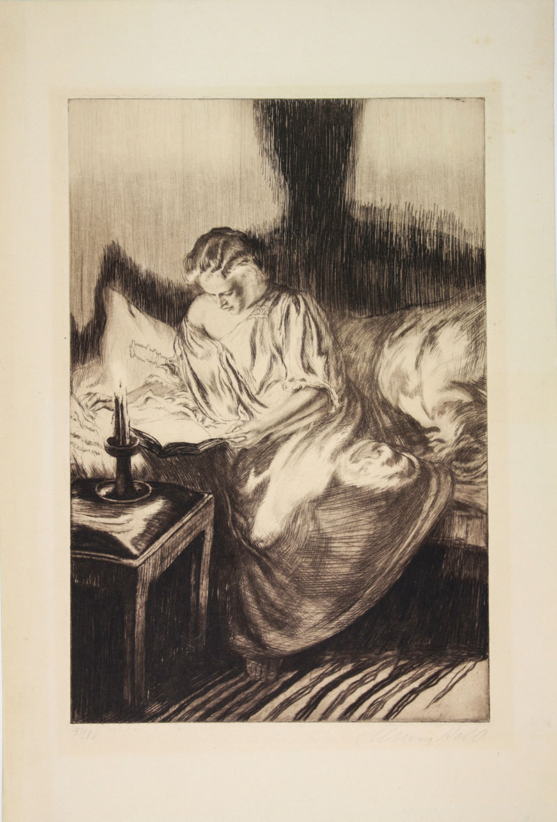 Alois Kolb (1875-1942). Lettura a lume di candela. Acquaforte. mm 370x244. Foglio: mm 495x330. Firmata e numerata «57/80» a matita in basso ai lati. Bellissima impressione in bistro stampata su carta avorio pesante. Ampi margini, lievissima ossidazione della carta e, al verso, residui di vecchio montaggio, per il resto ottima conservazione.