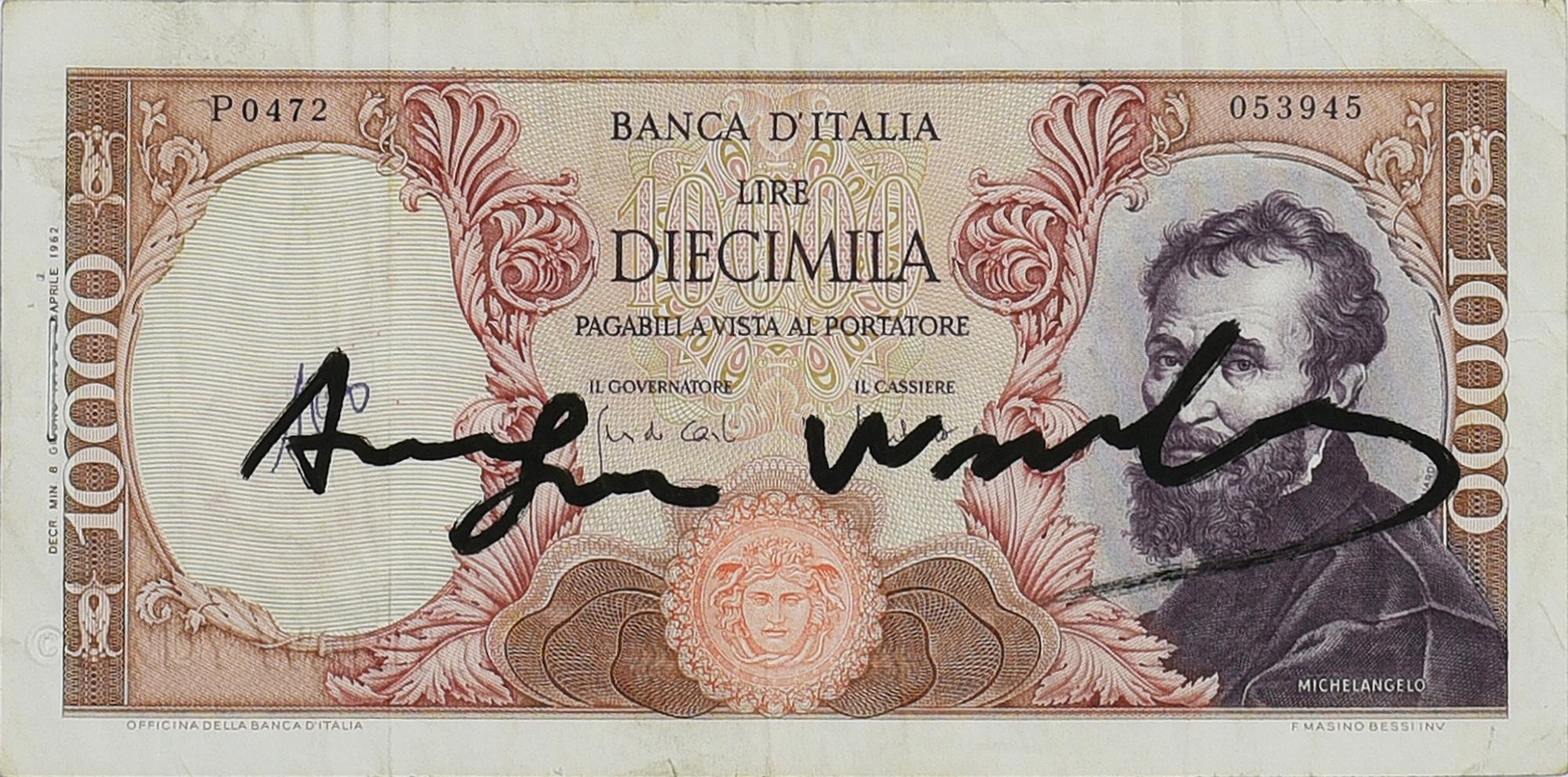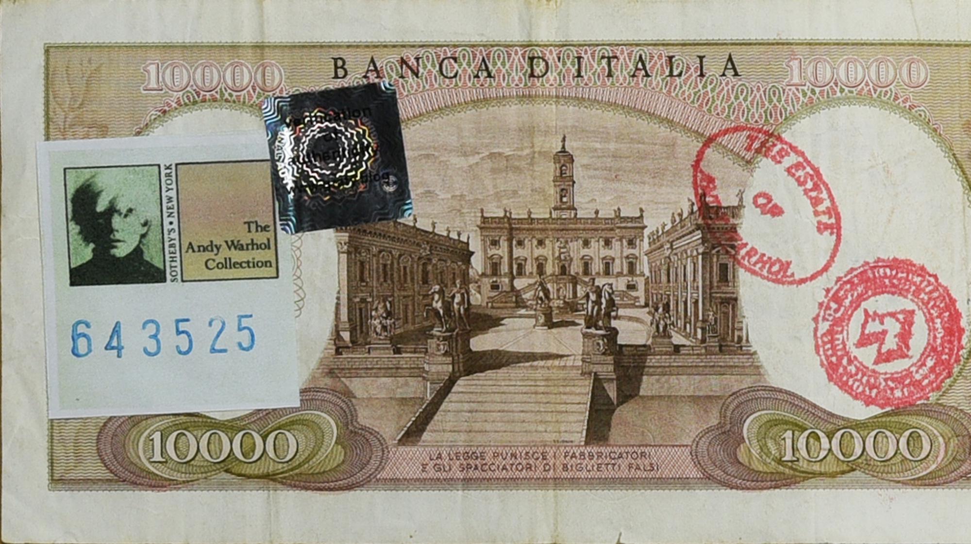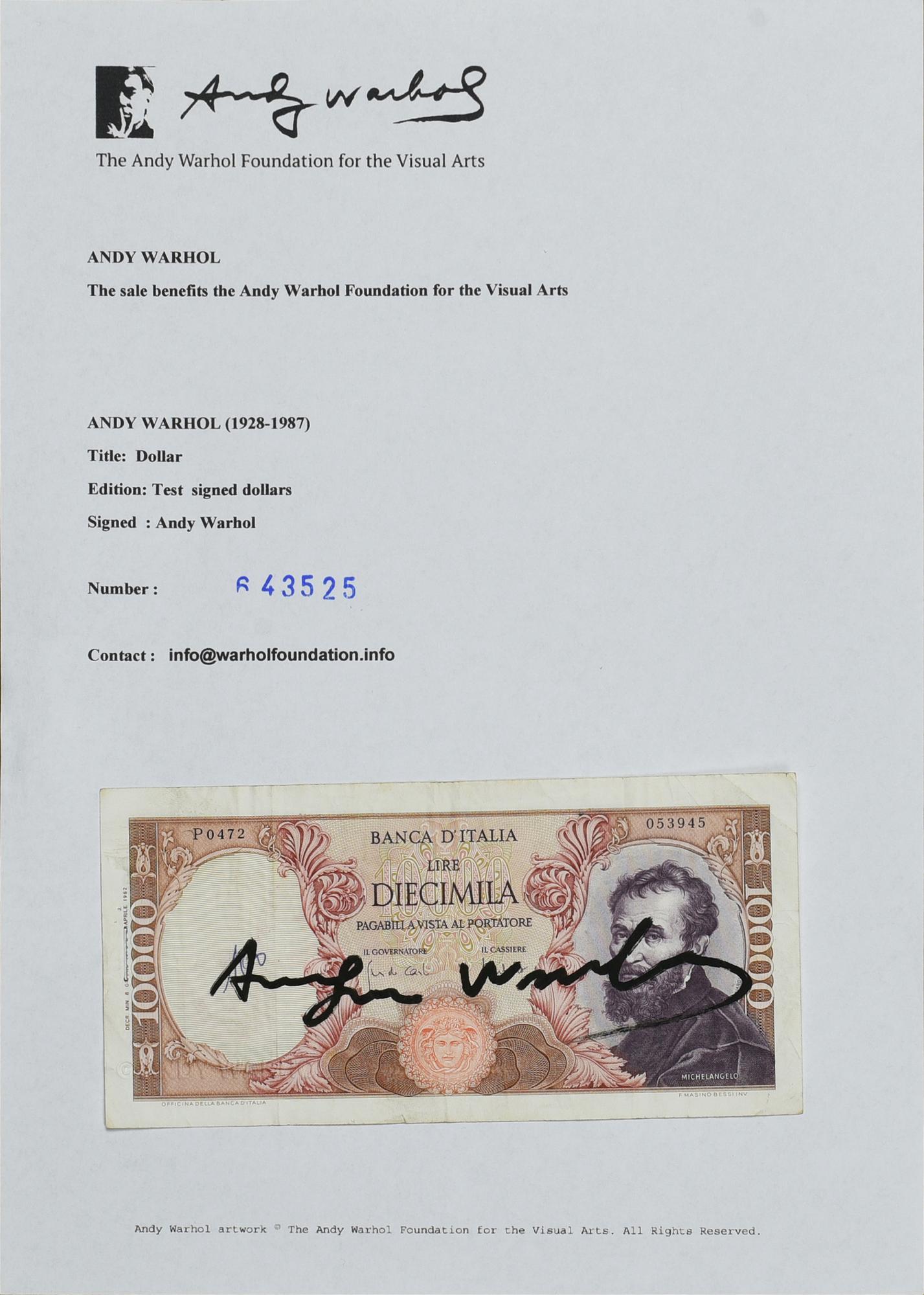 Andy Warhol DIECIMILA LIRE pennafeltro su banconota, cm 8x16 firma e timbro a...