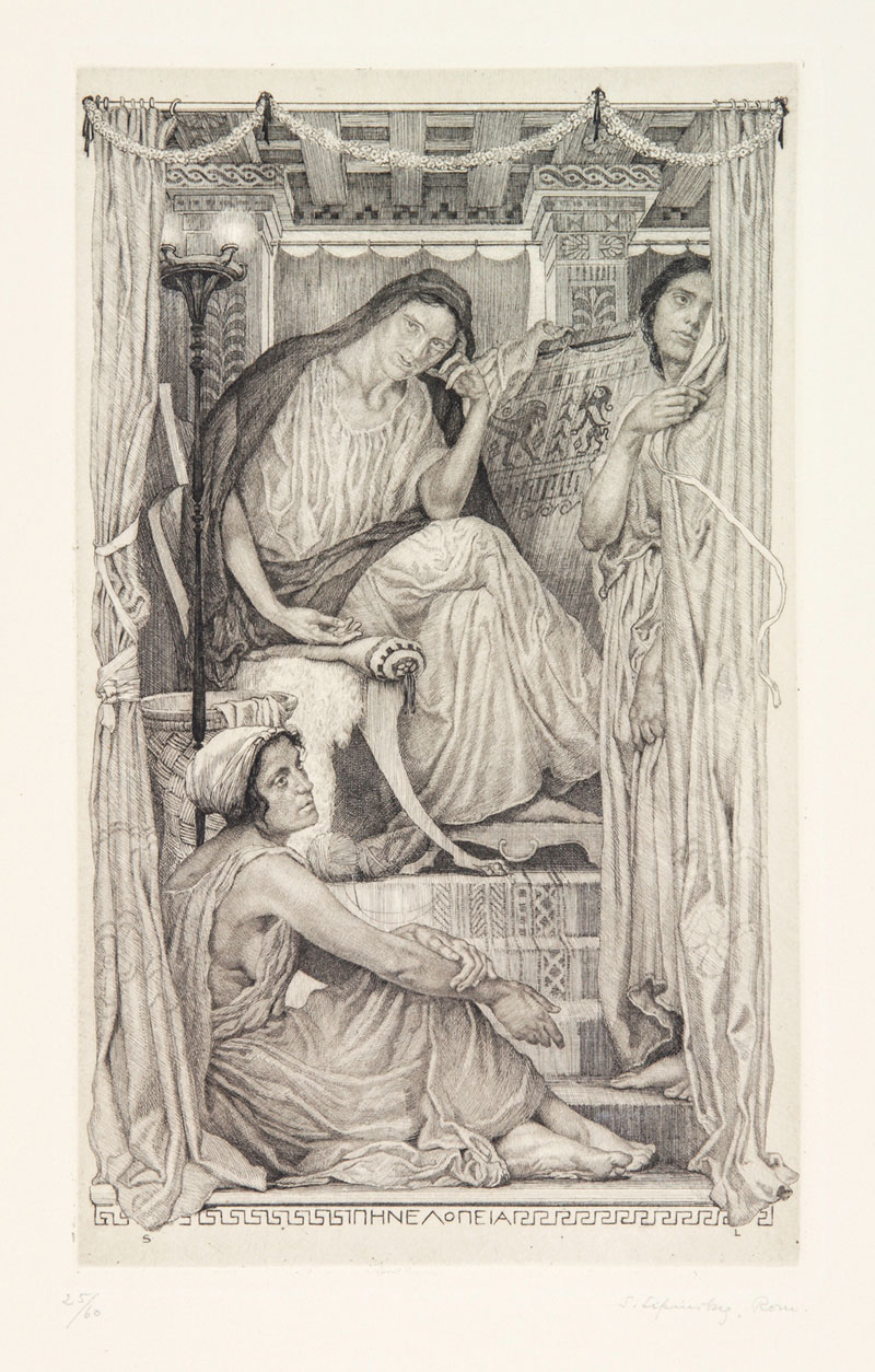 Sigmund Lipinsky (1873-1940). Penelope. 1927. Acquaforte e incisione ad ago. mm 239x147. Foglio: mm 480x320. Lipinsky, 26. Grochala, 25. Bardazzi/Cingottini, 21. Siglata sulla lastra in basso ai lati. Titolo in greco inciso in basso al centro. Firmata e numerata a matita «25/60» in basso ai lati. Seconda tavola tratta dal ciclo Odissea, serie di 8 incisioni eseguite fra il 1923 ed il 1928 ed edite a Monaco di Baviera da Franz Hanfstängl nel 1929. Bellissima impressione stampata con inchiostrazione nitida e brillante su carta calcografica avorio. Grandi margini originari, ottima conservazione.