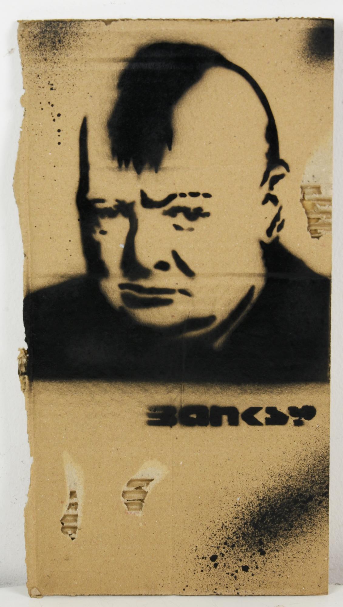 Banksy TURF WAR sprayed stencil graffiti su cartone, cm 37x19 sul retro:...