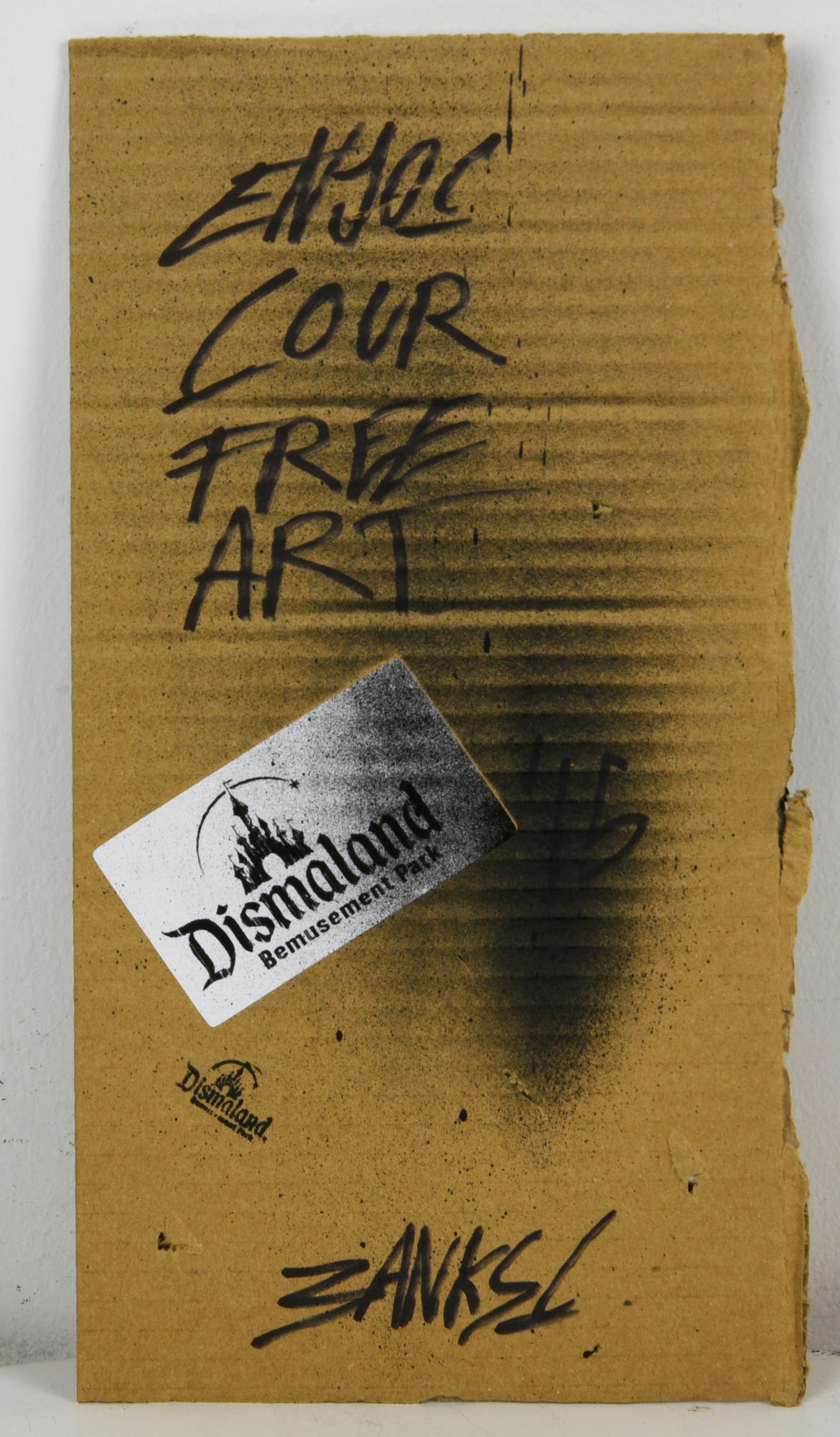 sul retro: timbro ed etichetta Dismaland, iscritto "enjoy your free art"