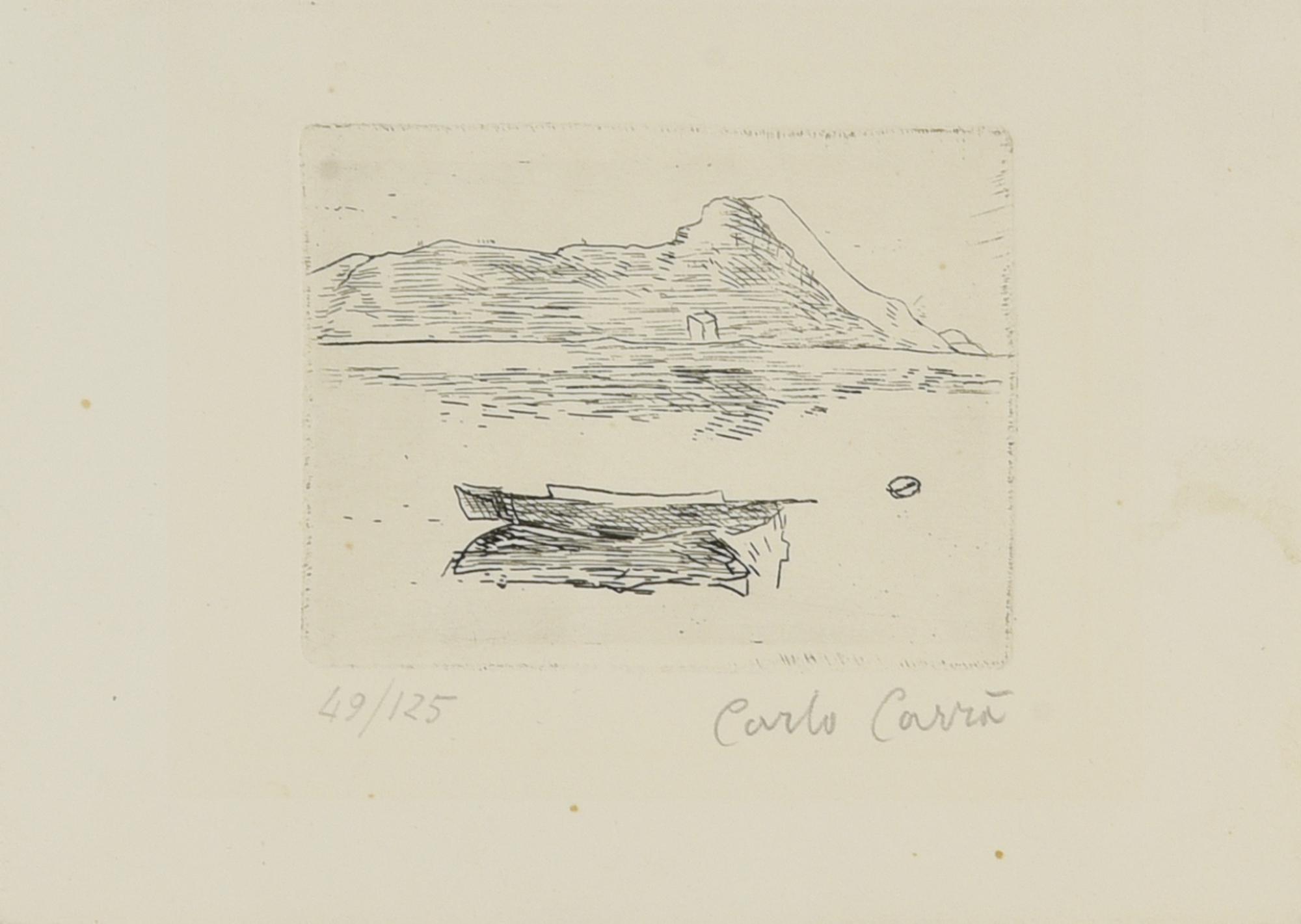 Carlo Carrà BARCA SOLITARIA acquaforte, cm7x9,3, su foglio cm 12,5x17; es....