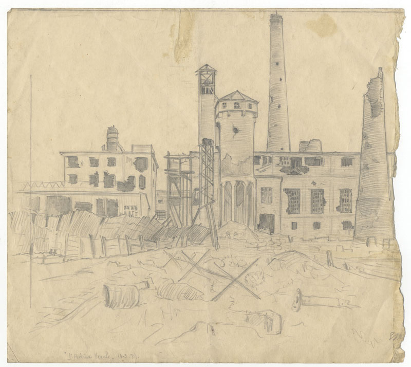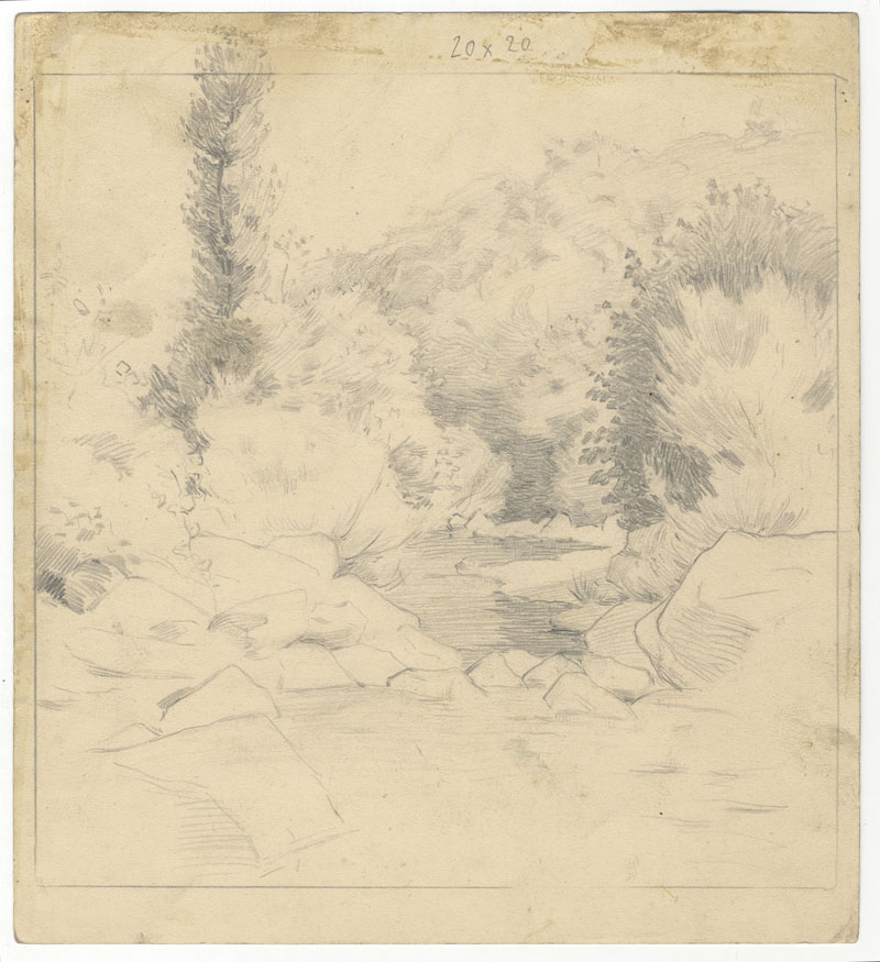 Emilio Mazzoni Zarini (1869-1949). Paesaggio con ruscello (studio per acquaforte). Fabbrica. 1917. Matita di grafite 1) mm 23x21. 2) mm 245x275. Siglato, titolato (L'Adria Verde?) e dato "14-3-17". Foglio 2: margine destro tagliato irregolarmente.
