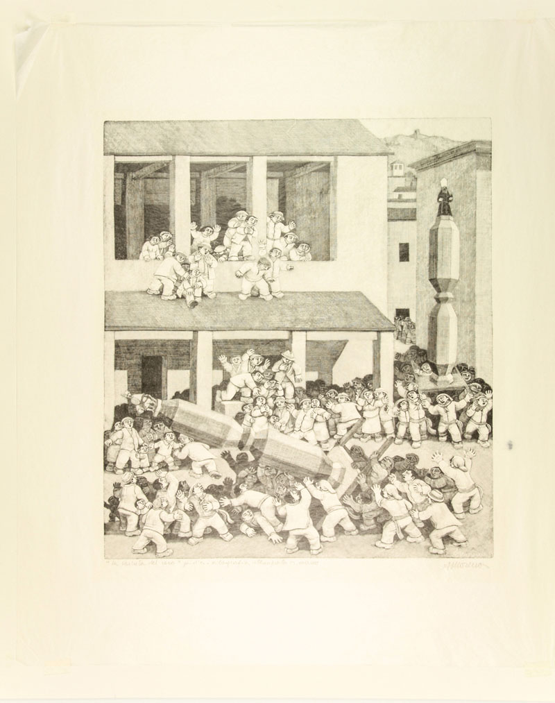 Alberico Morena (1926- ). La caduta del cero. 1959. Xilografia su velina mm.400x350. Foglio: mm. 580x510. Nella matrice in basso a destra firma e data, firma ripetuta sotto a matita. In basso a sinistra titolo e "p.d'a. xilografia stampata a mano". -