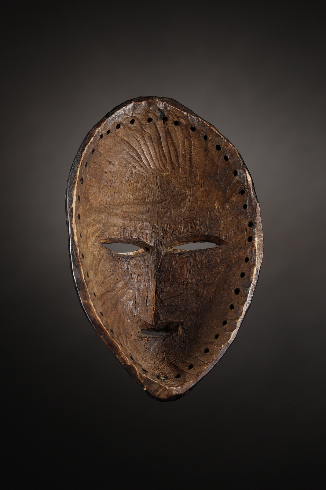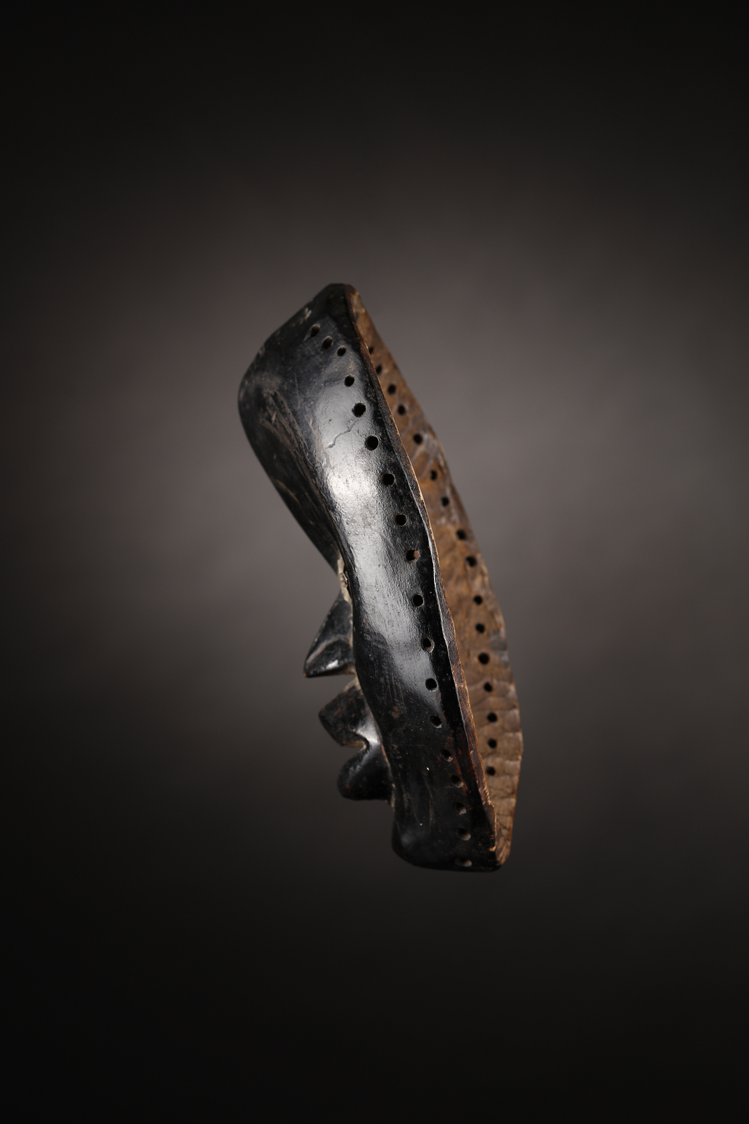 Il metallo utilizzato aiuta a collocare questa maschera in uno spazio temporale non particolarmente antico, ma questa maschera dai volumi pieni ed equilibrati, non risulta esser stata invecchiata artificialmente in nessuna sua parte. La patina della vernice nera con cui è stata più volte dipinta contiene piccole tracce di colore rosso, retaggio di chissà quale storia ed al retro risulta sapientemente scolpita dall uomo e magnificamente lucidata dall'usura e dal tempo.