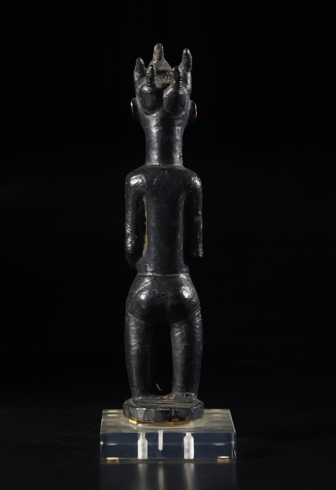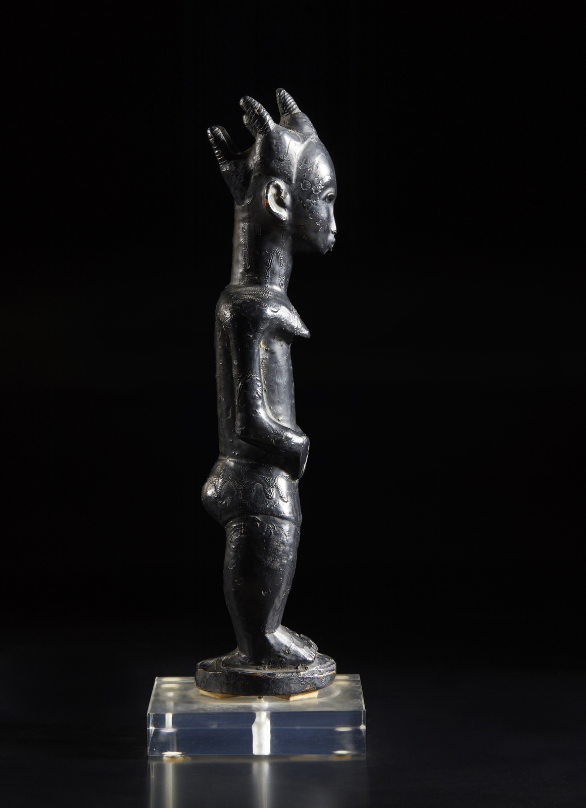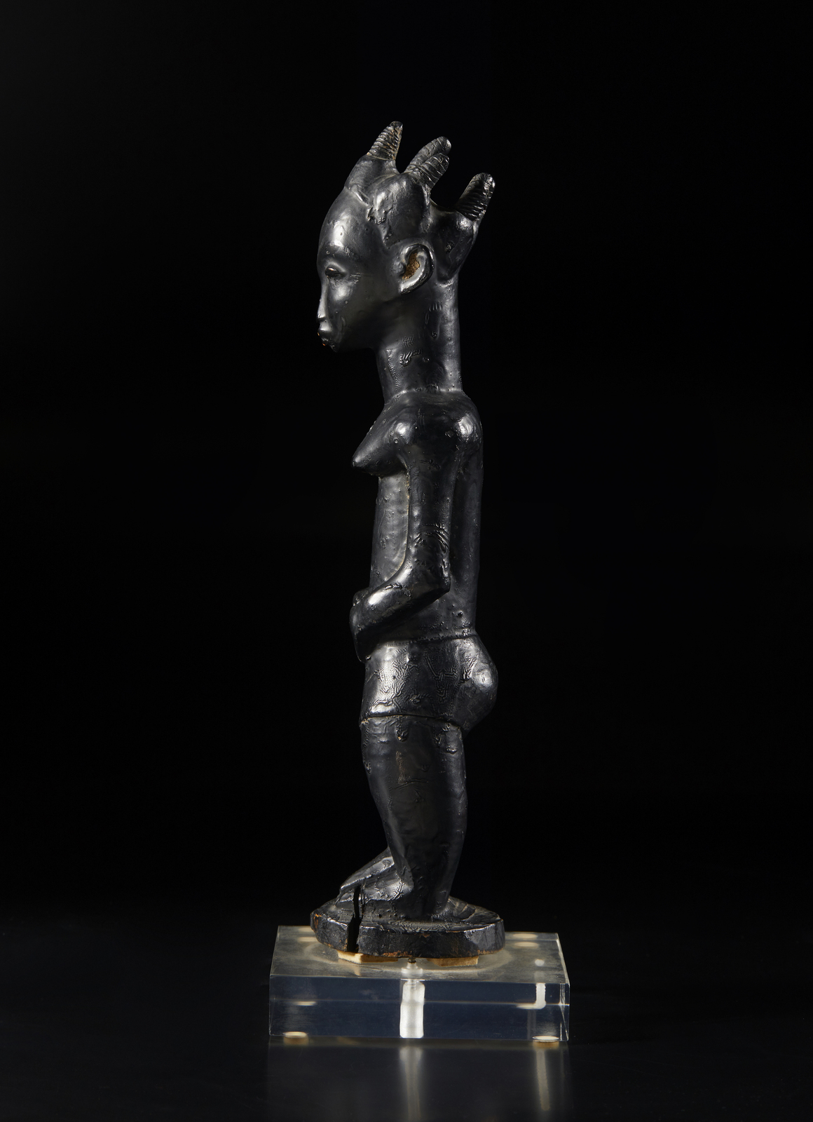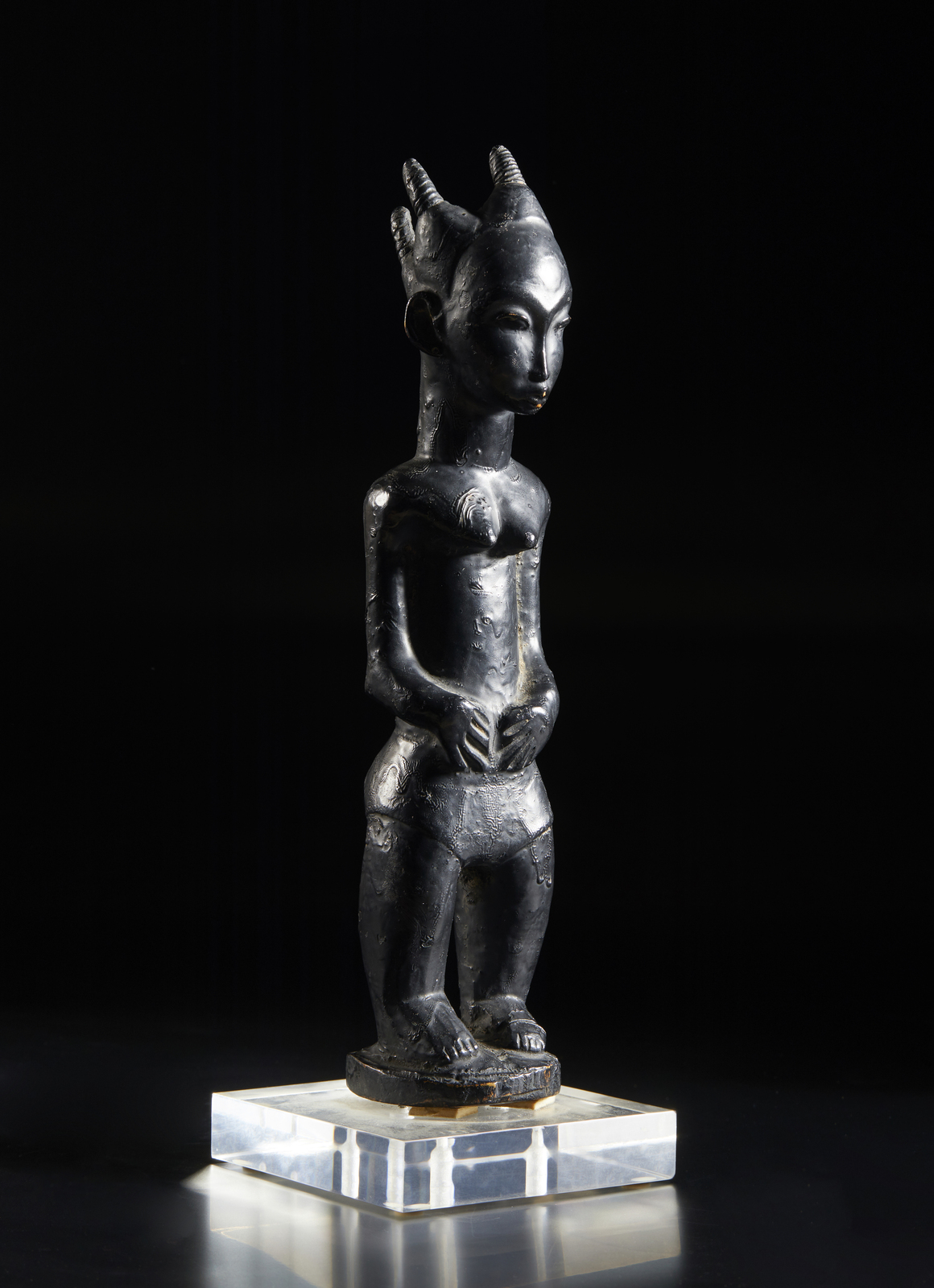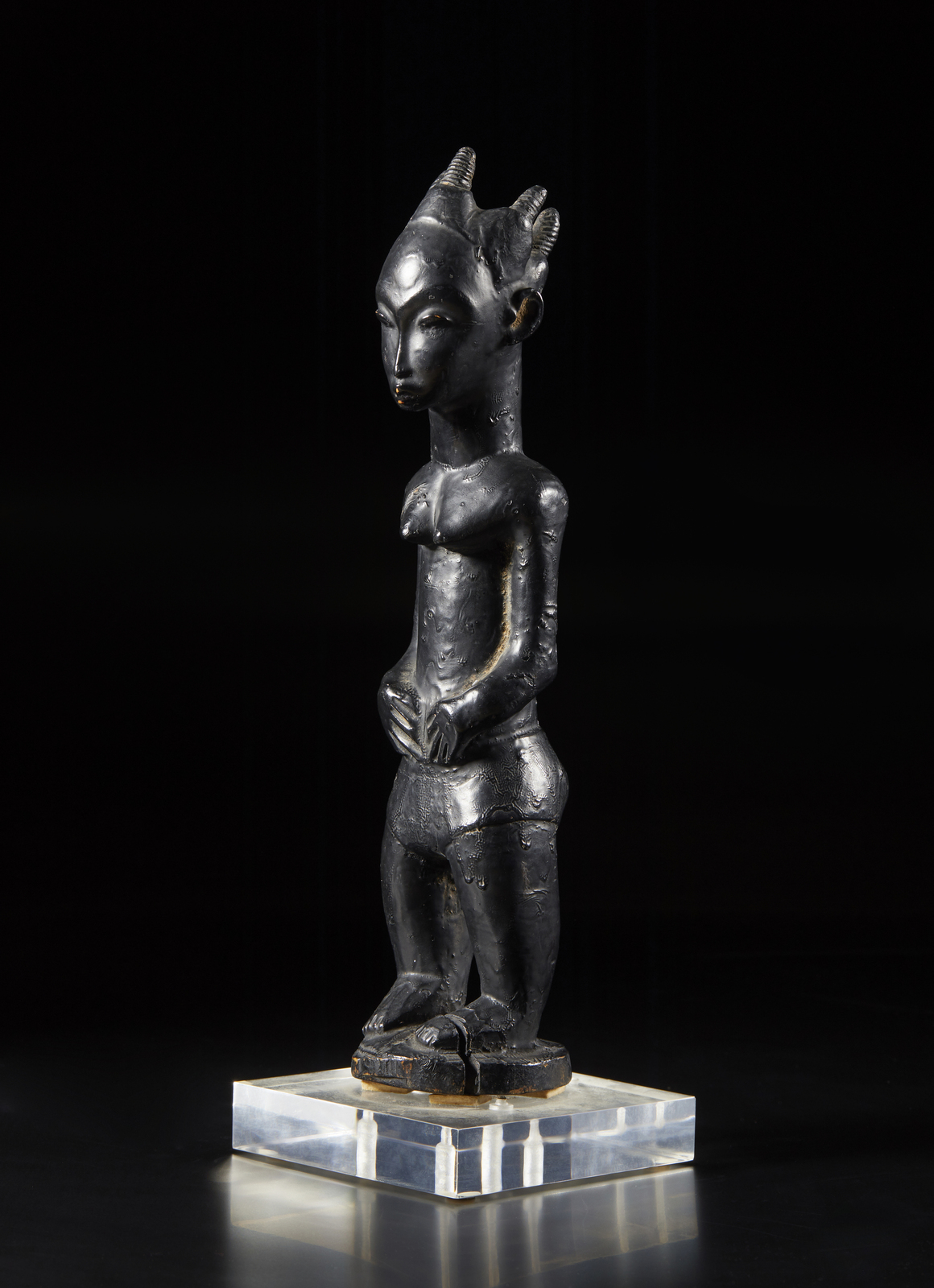 Con base in plexiglass. . Cm 7,00 x 33,00 x 8,00. La grande qualita d'intaglio di questa scultura femminile Baulè, di probabile epoca coloniale come ci suggerisce la presenza di pudici pantaloncini, risulta evidente dall'osservazione del corpo, magistralmente proporzionato, del volto, dolce ed espressivamente corrucciato e dell elaborata quanto elegante acconciatura dei capelli.