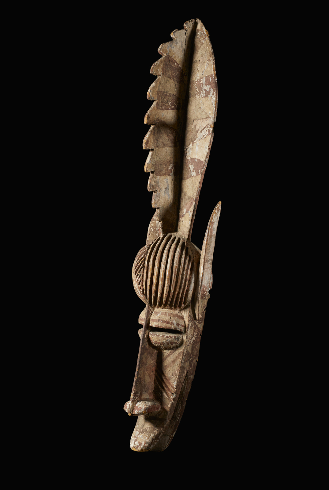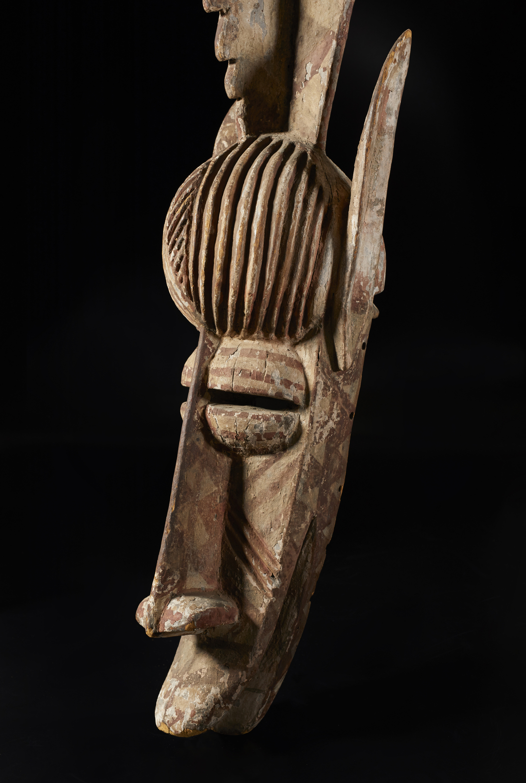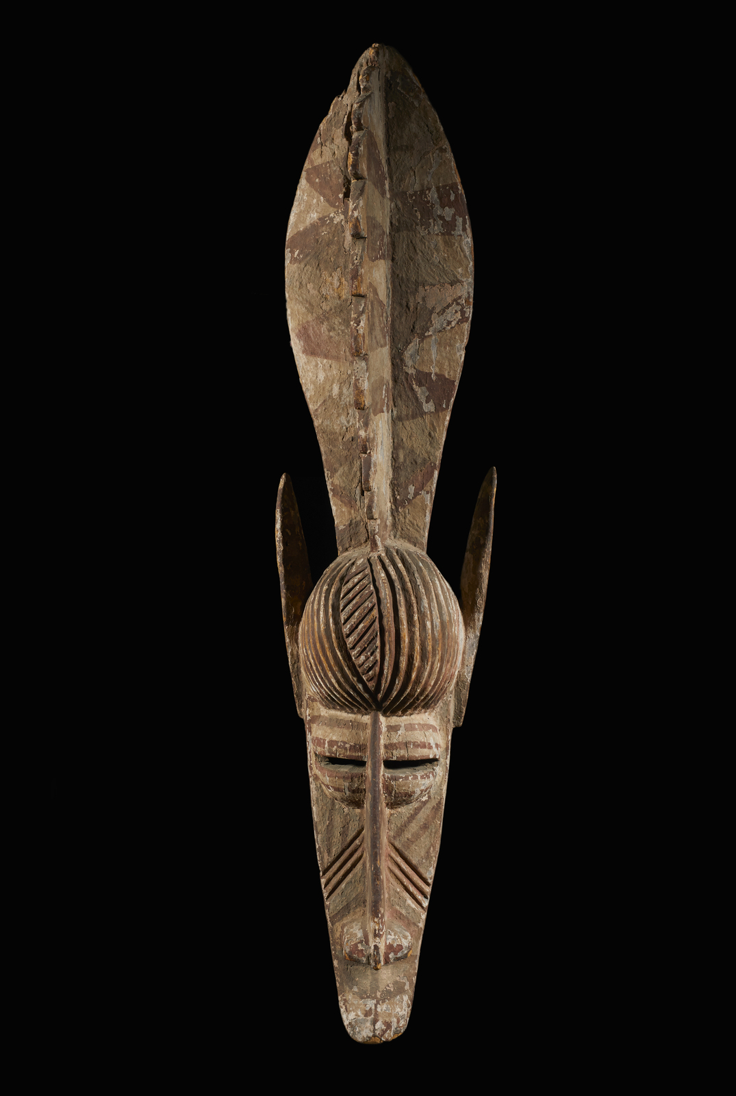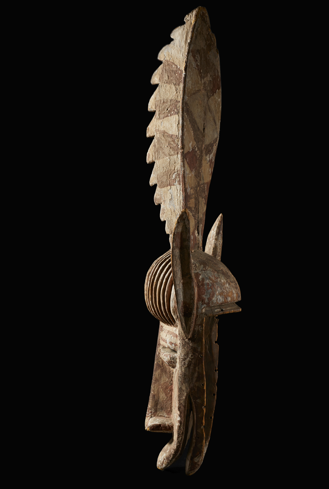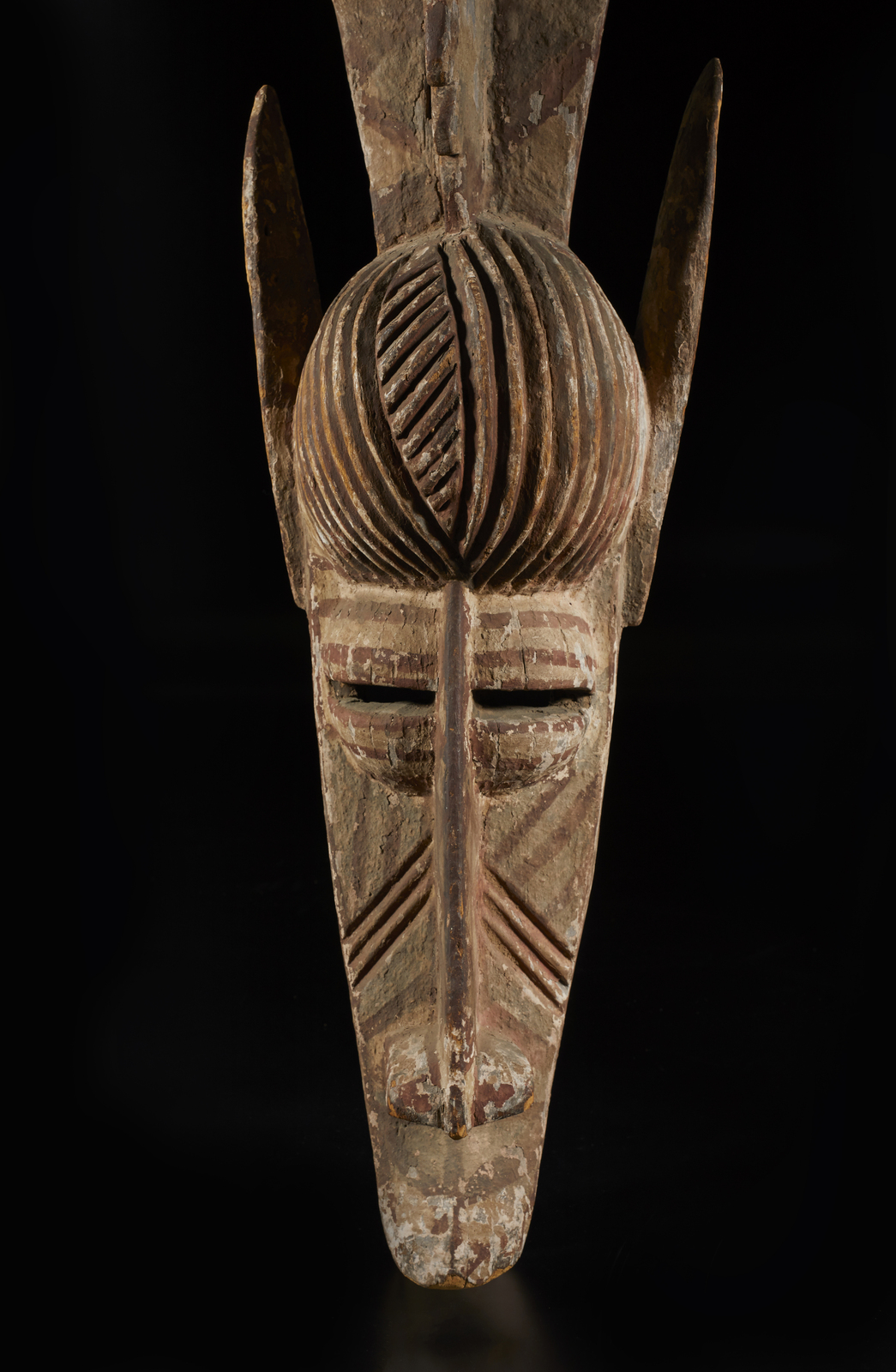 . . Cm 31,00 x 139,00 x 31,00. Usualmente scolpite ed indossate dai fabbri durante i riti di iniziazione ed i funerali, le maschere dei Bobo erano spesso rappresentate con volti antropomorfi, ma con corna o creste come questa, che simboleggiavano l'energia e la forza spirituale degli animali della foresta.