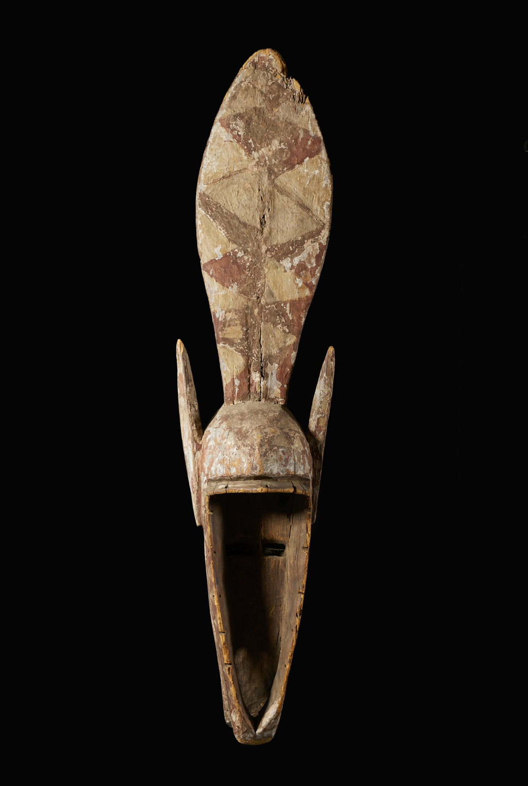 Questa grande maschera in legno caratterizzata da cresta dentellata, fronte bombata con profondi solchi asimmetrici, occhi a nacchera ed un enorme naso, è stata in origine interamente coperta da caolino e poi accuratamente dipinta con pigmenti naturali a figure geometriche. Ciò risulta evidente osservando i punti in cui il pigmento è saltato lasciando intravedere il sottostante bianco del caolino.
